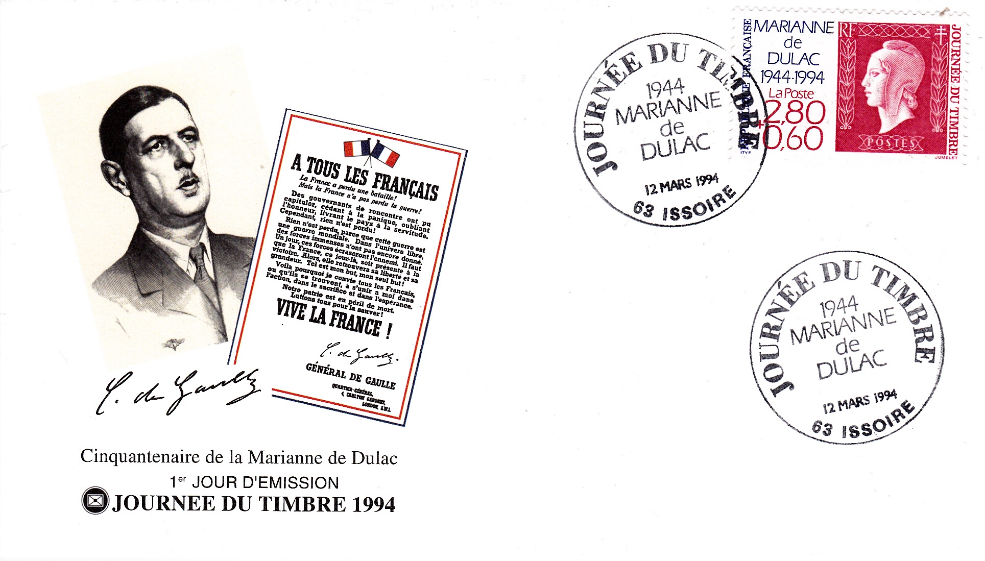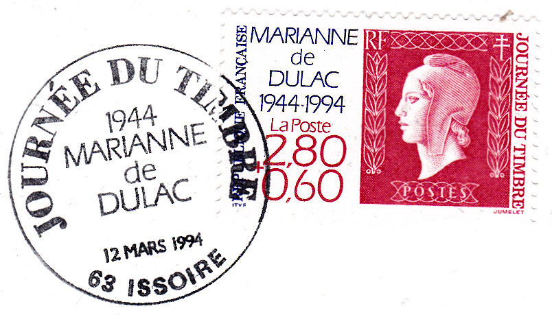 Am 12.3.1994 erschien eine Zuschlagsmarke zum Tag der Briefmarke 1994 in Frankreich mit der Abbildung des Motives der Marken Frankreich MiNr. 709-728 mit der Marianne mit Jakobinermütze, die 50 Jahre zuvor im Jahre 1944 ausgegeben wurden. Die Marke gibt es in zwei verschiedenen Zähnungen (A = gez. K 13, C = gez. K 13 1/4:13). Hier ein Exemplar mit Sonderstempel aus Issoire auf einem FDC der Fédération des Sociétés Philatéliques Francaises.
