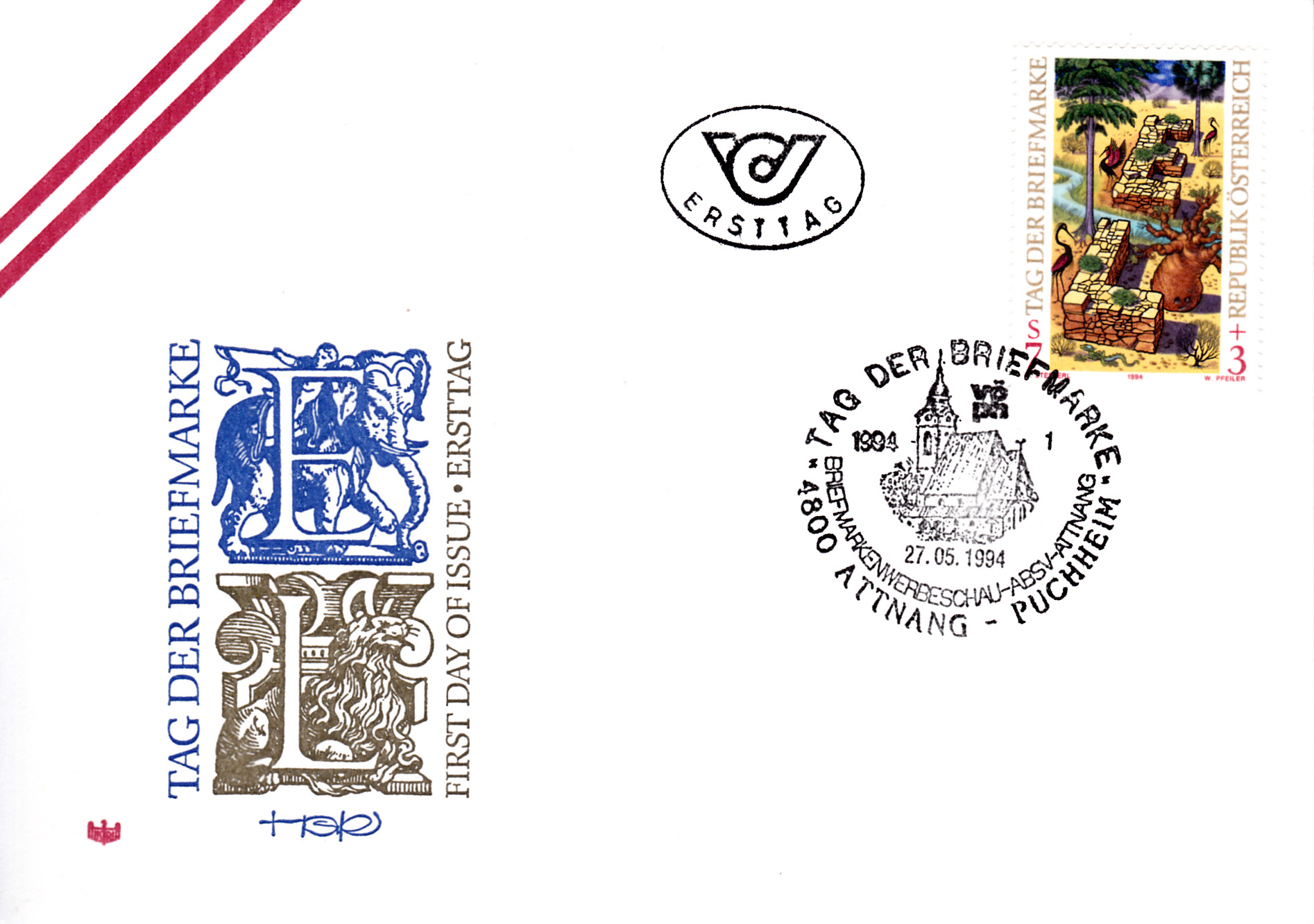 FDC mit dem Sonderstempel zum Tag der Briefmarke 1994 aus Attnang mit der Kennziffer "1".
