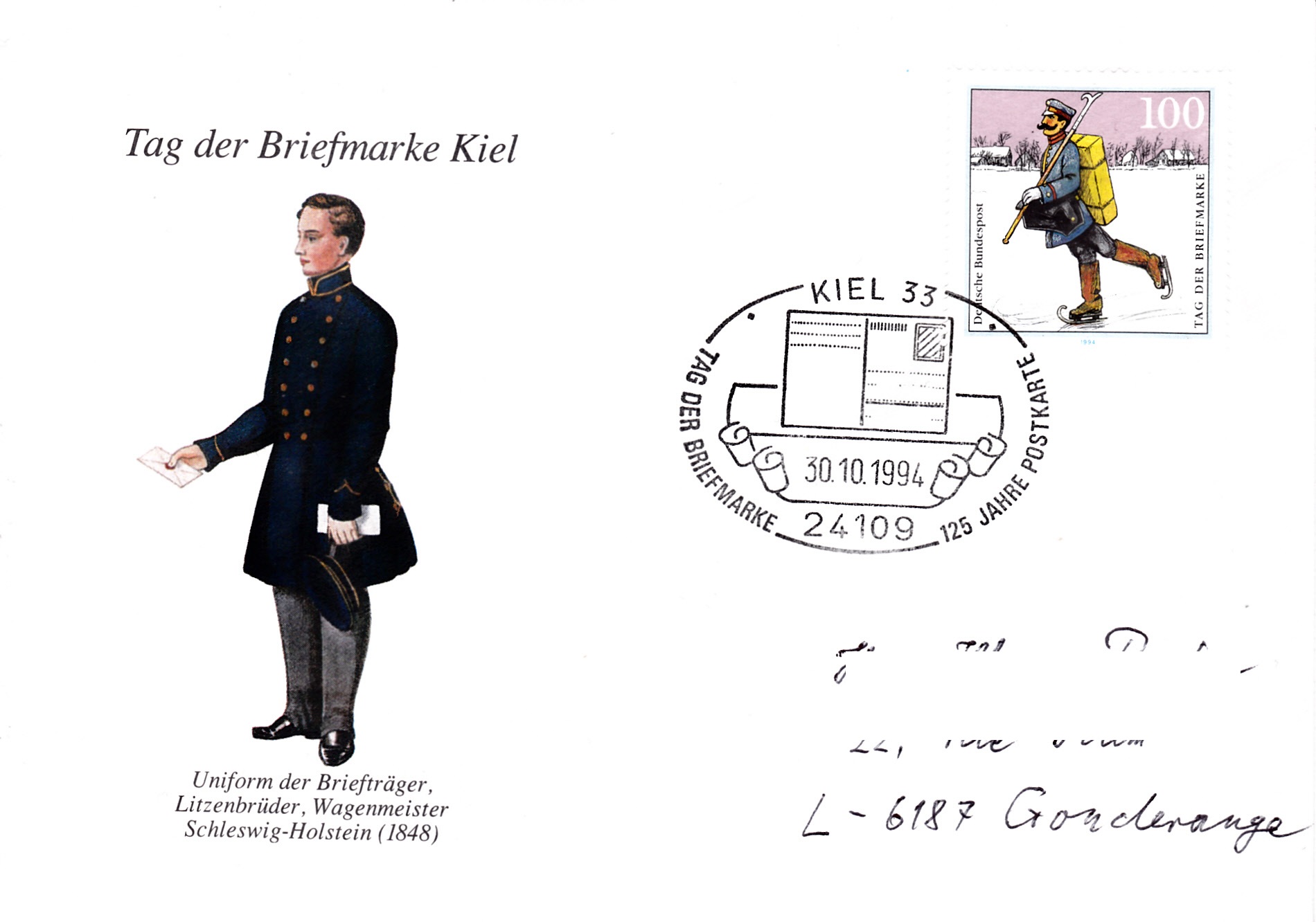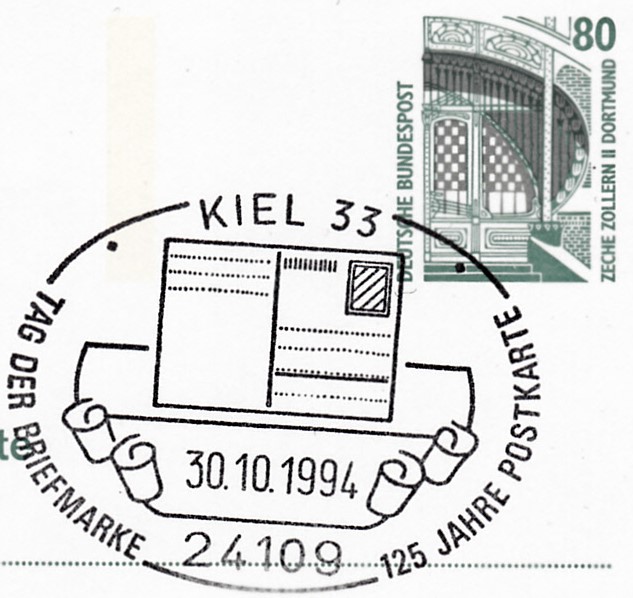 Sonderstempel vom 30.10.1994 aus Kiel zum Tag der Briefmarke 1994 auf einer Ganzsache mit dem Zudruck einer Postkarte.