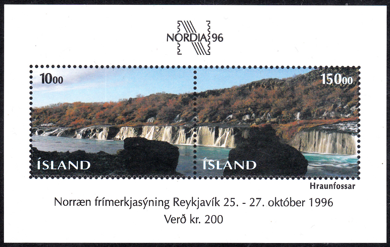 In Island erschien zum Tag der Briefmarke 1995 und zur Internationalen Briefmarkenausstellung NORDIA ’96 in Reykjavík am 9.10.1995 ein Block mit zwei Marken (MiNr Block 18 mit den Marken MiNr 835 und 836). Die beiden Marken haben das Motiv "Hraunfossar", das sind Wasserfälle des Flusses Hvítá in der Nähe der Orte Húsafell und Reykholt im Westen Islands. Auf einer Länge von ca. 700 Meter strömt in über hundert kleinen Wasserfällen schäumend und sprudelnd Wasser aus dem schwarzen Gestein des ca. 1.000 Jahre alten Lavafeldes Hallmundarhraun.
