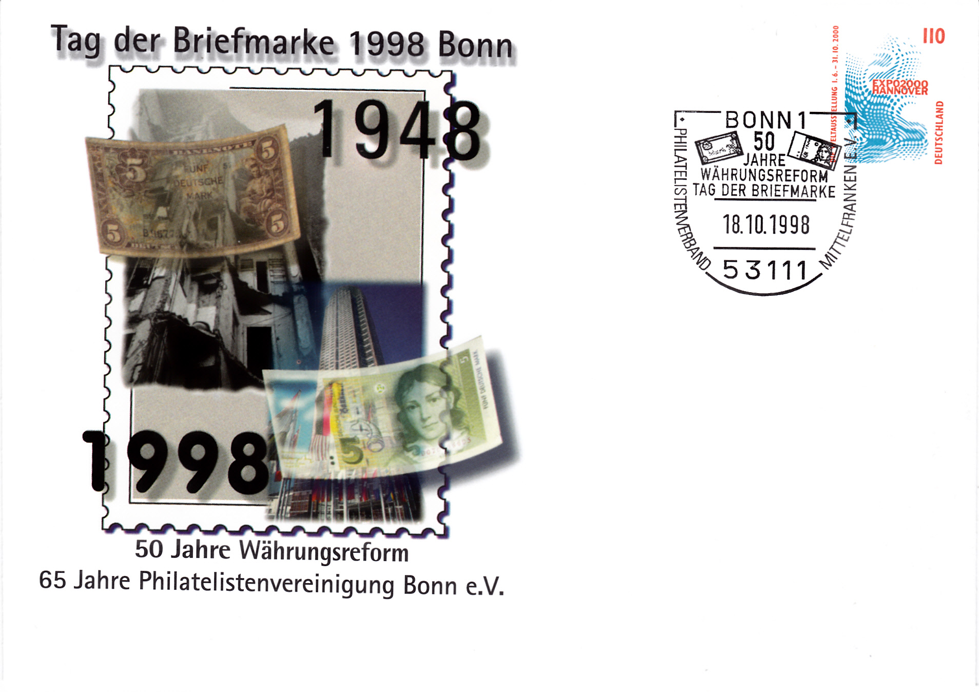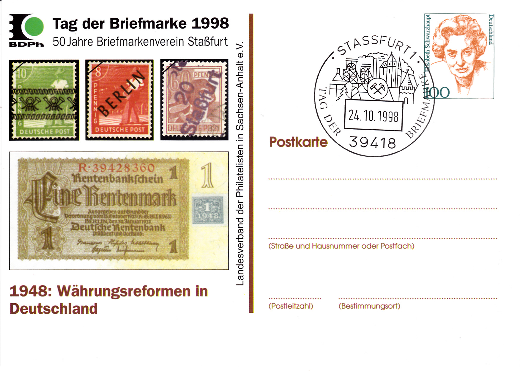 Ganzsache des LV der Philatelisten in Sachsen-Anhalt e.V. mit dem dazu passenden Sonderstempel vom 24.10.1998 aus Stassfurt zum Tag der Briefmarke 1998.