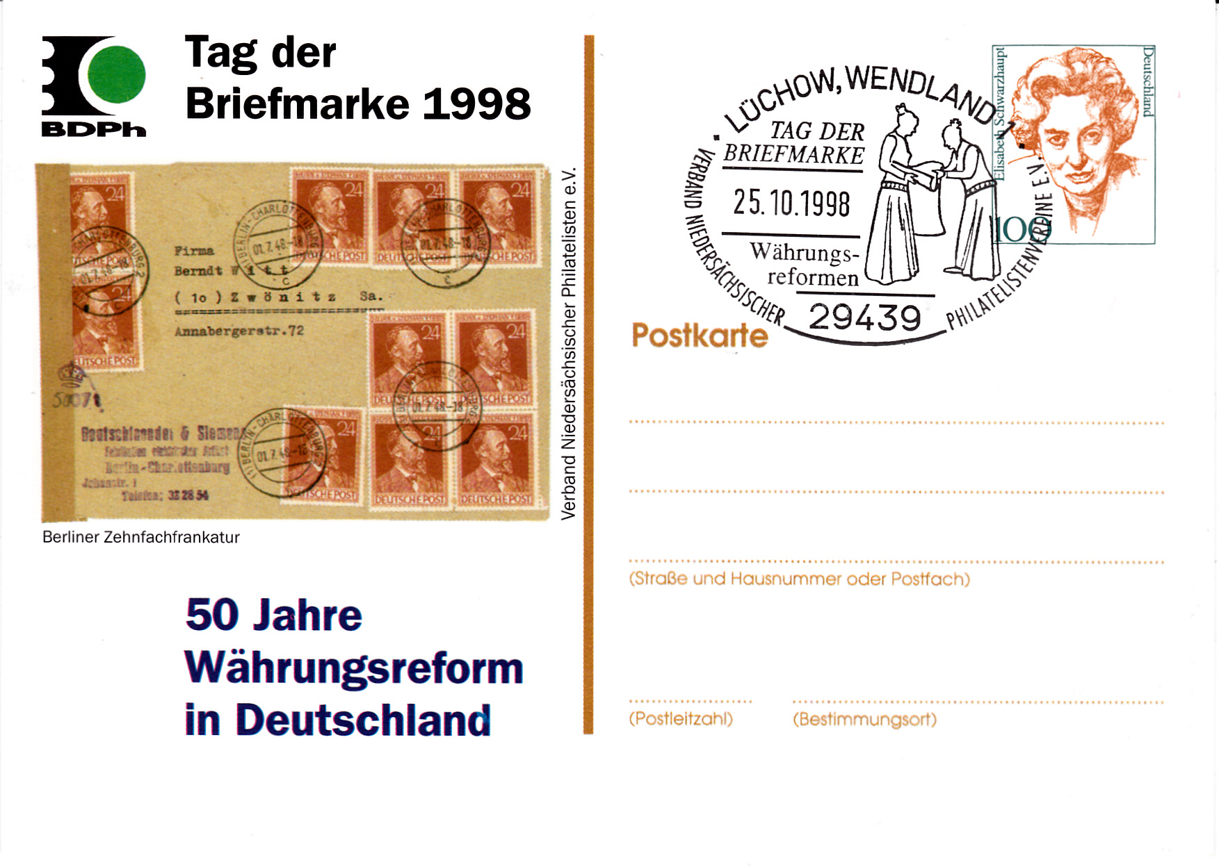 Ganzsache des Verbandes der Niedersächsischen Philatelistenvereine e.V. mit dem dazu passenden Sonderstempel vom 25.10.1998 aus Lüchow zum Tag der Briefmarke 1998.