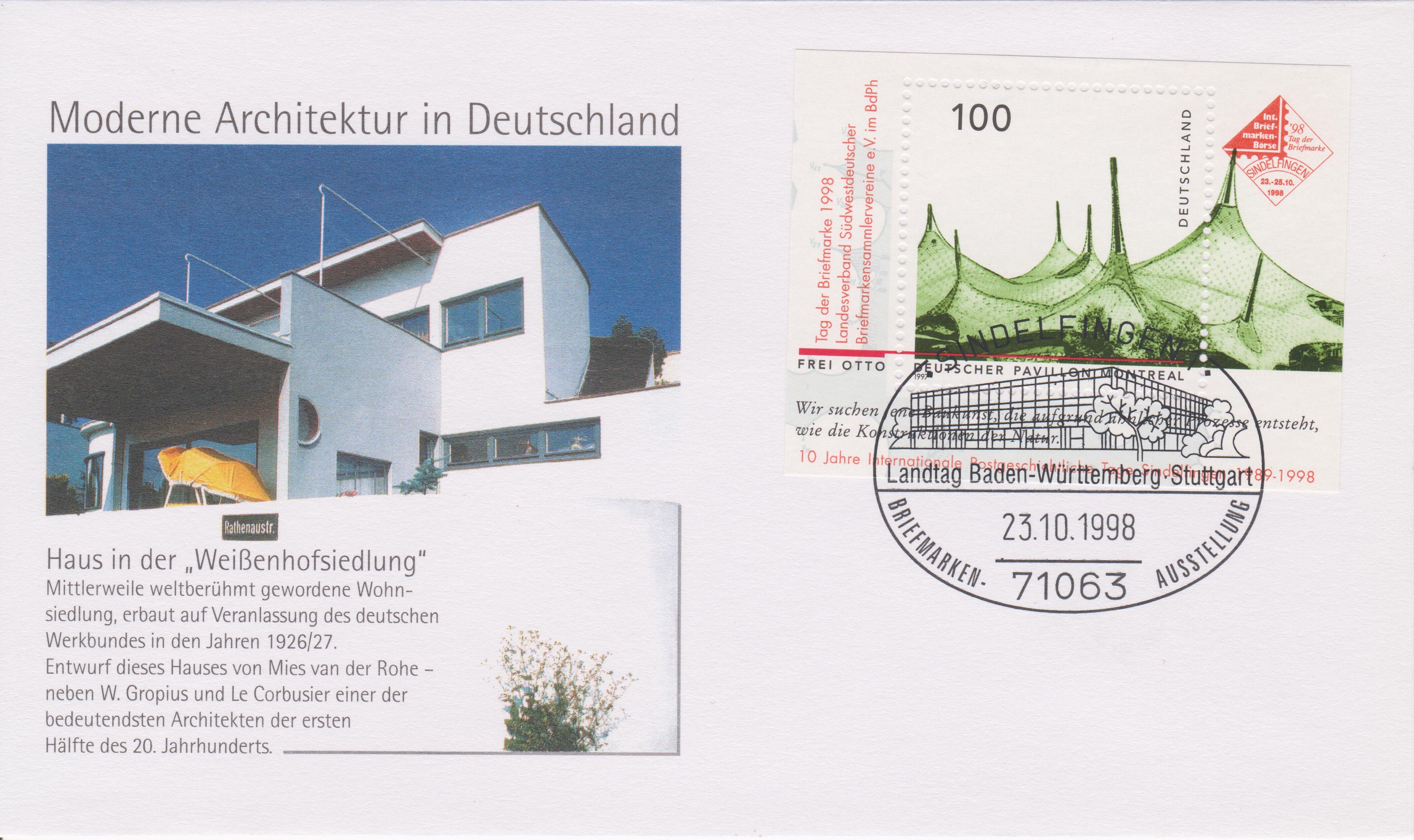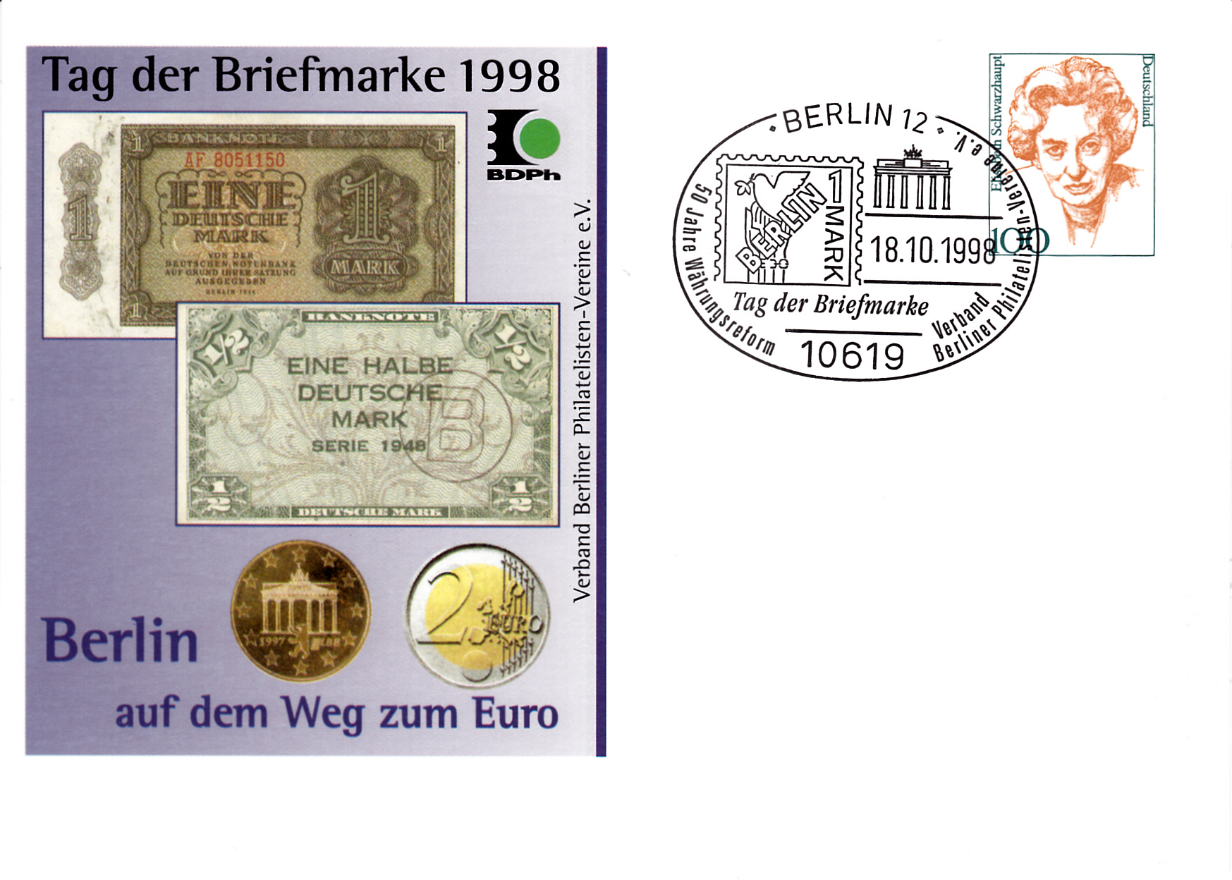 Ganzsache des Verbandes Berliner Philatelisten-Vereine e.V. mit dem dazu passenden Sonderstempel vom 18.10.1998 aus Berlin zum Tag der Briefmarke 1998.