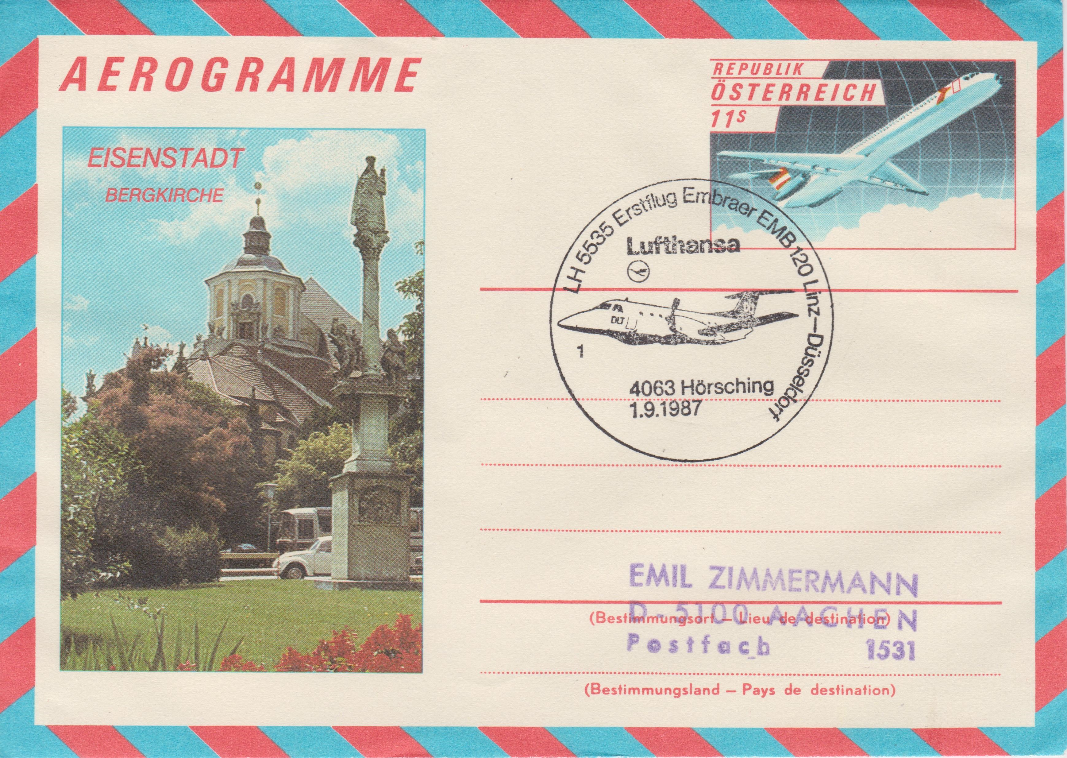 Dieses Aerogramm dokumentiert den Erstflug LH 5535 einer Embraer EMB 120 Linz - Düsseldorf am 01.09.1987: