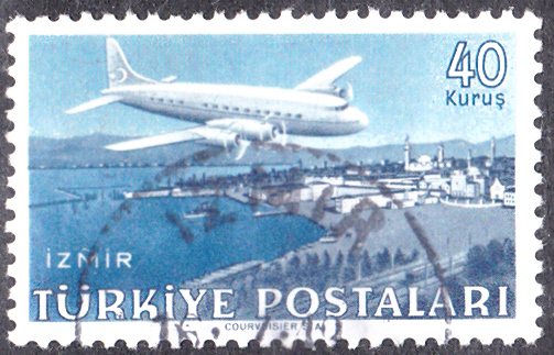 Eine Marke aus der Türkei (MiNr 1225) zeigt ein Flugzeug Douglas DC 6 über Izmir.