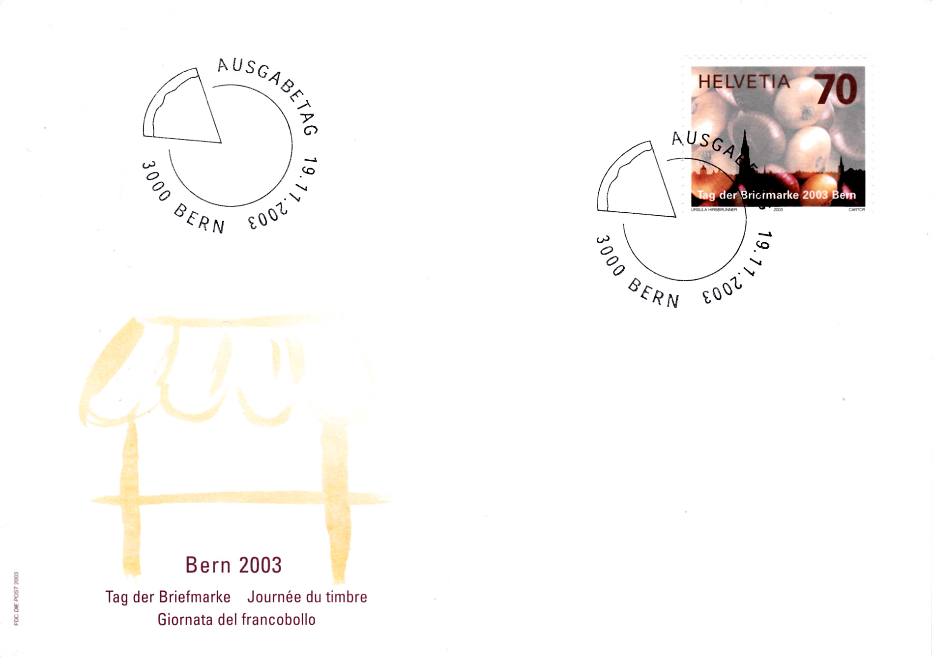 In der Schweiz ist zum Tag der Briefmarke 2003 am 19.11.2003 diese Marke erschienen. Sie zeigt die Graphik "Berner Zibelemärit" (ein Jahrmarkt mit Volksfestcharakter in Bern) von Ursula Hirsbrunner (Gewinnerin des Wettbewerbs für Briefmarkengestaltung).