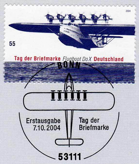 Dieser Gedenkumschlag (MiNr USo 100) zum Jubiläum "75 Jahre Ost-West-Ozeanflug der Dornier Wal" hat einen Wertstempel "Tag der Briefmarke 2004" (MiNr 2428).