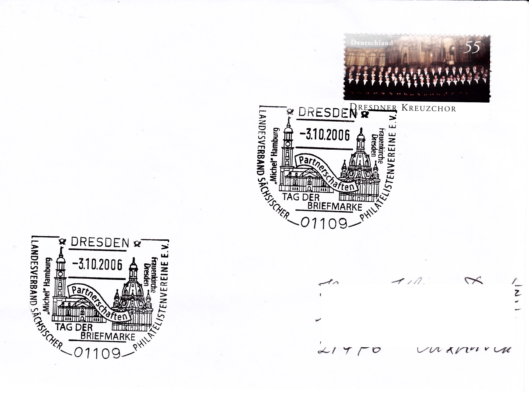 Gelaufener Brief mit dem Sonderstempel vom 3.10.2006 aus Dresden zum Tag de Briefmarke 2006.