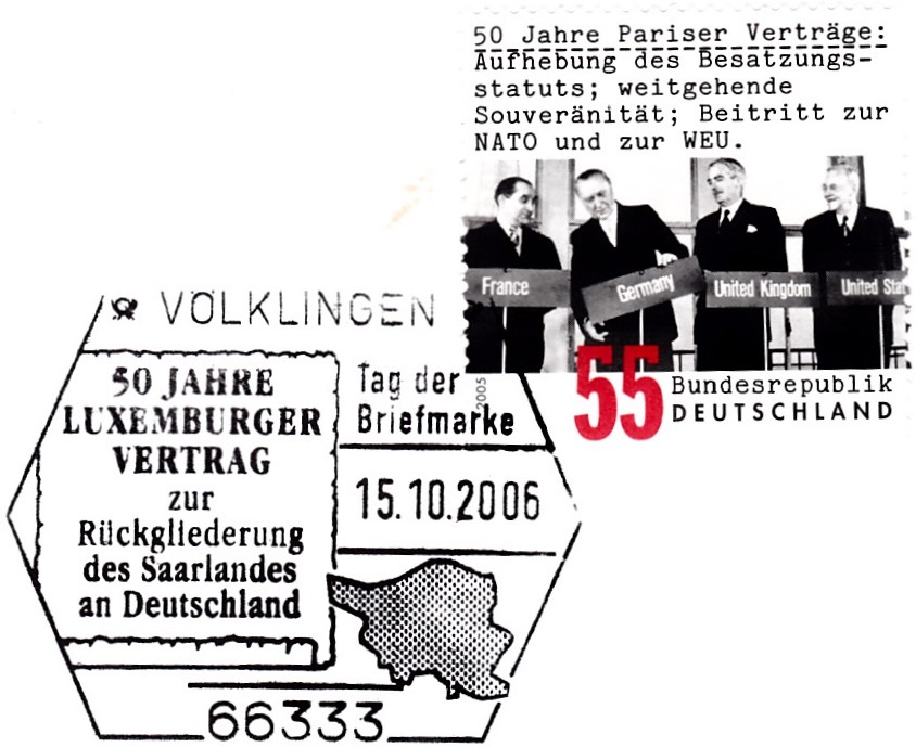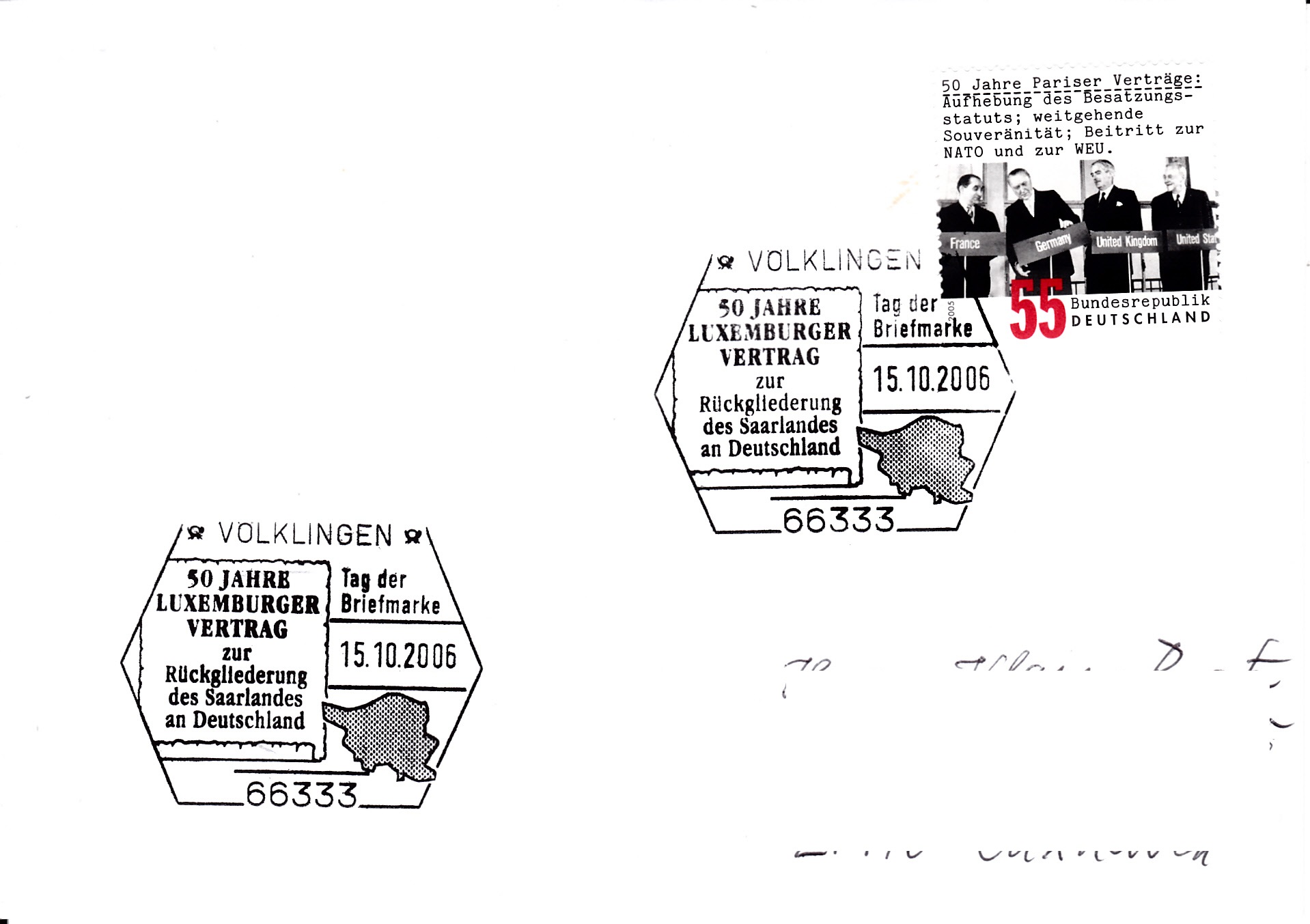 Gelaufener Brief mit dem Sonderstempel vom 15.10.2006 aus Völklingen zum Tag der Briefmarke 2006.