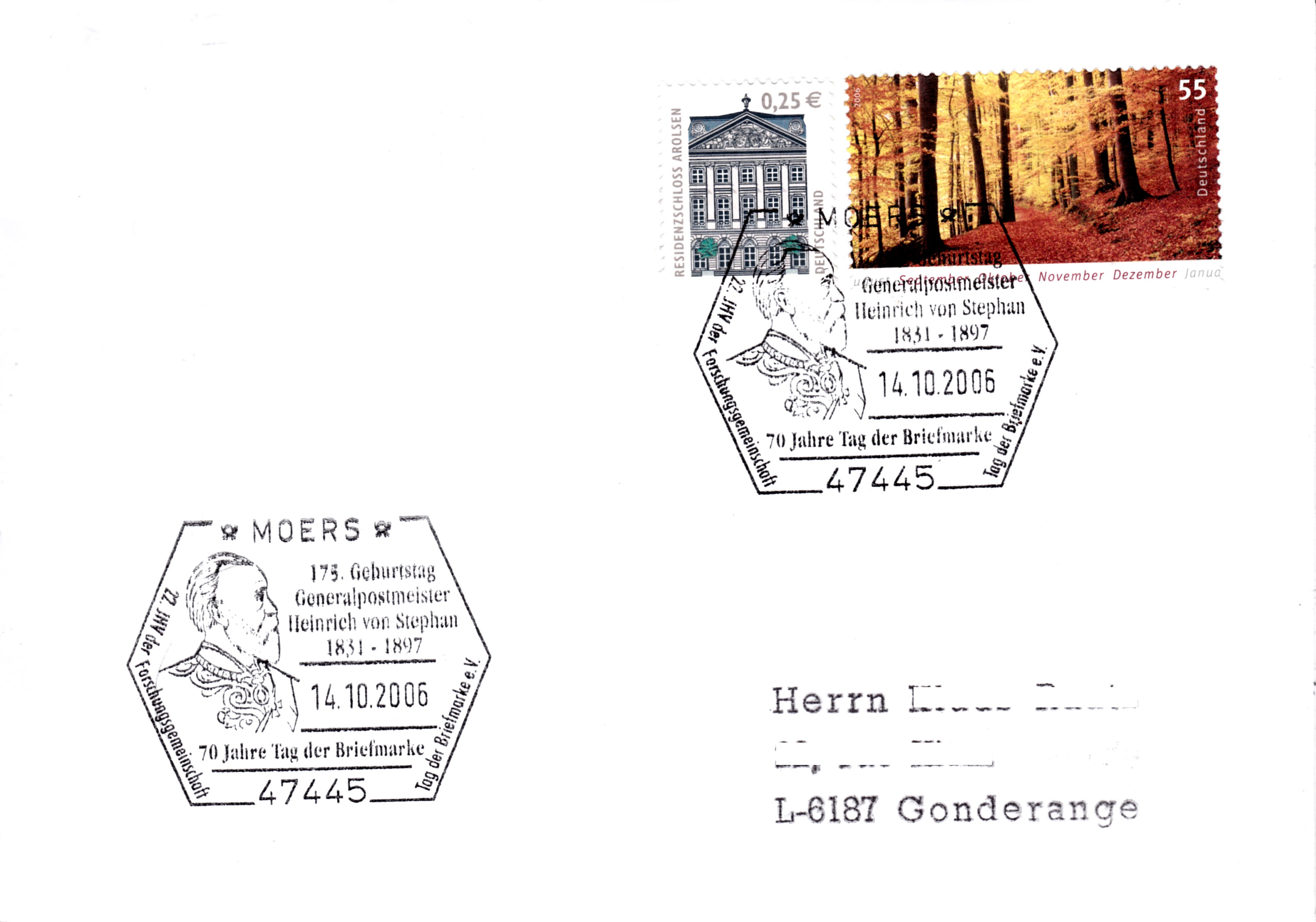 Sonderstempel aus Moers vom 14.10.2006 zur HV der Forschungsgemeinschaft "Tag der Briefmarke e.V." und zum Jubiläum "70 Jahre Tag der Briefmarke".