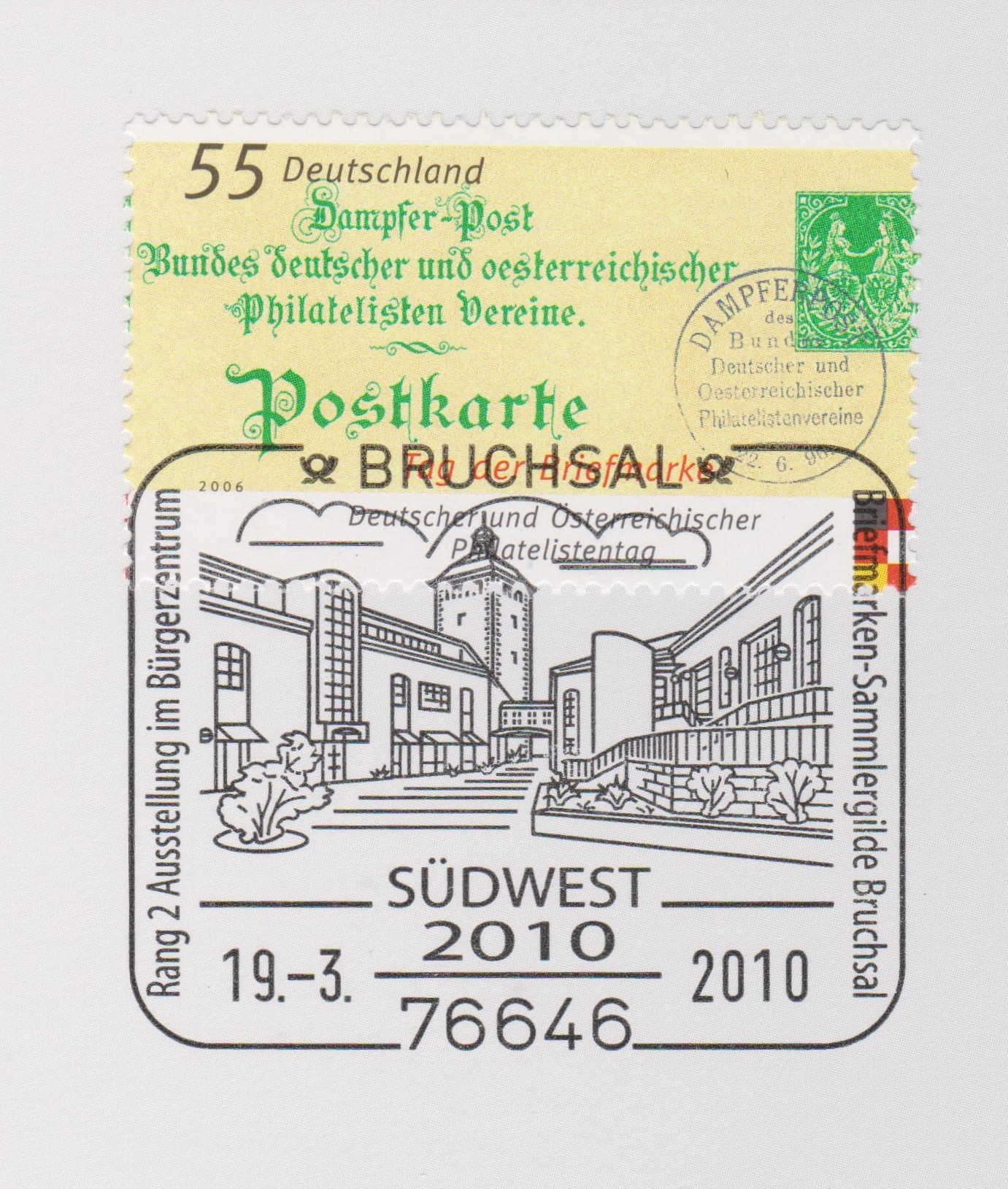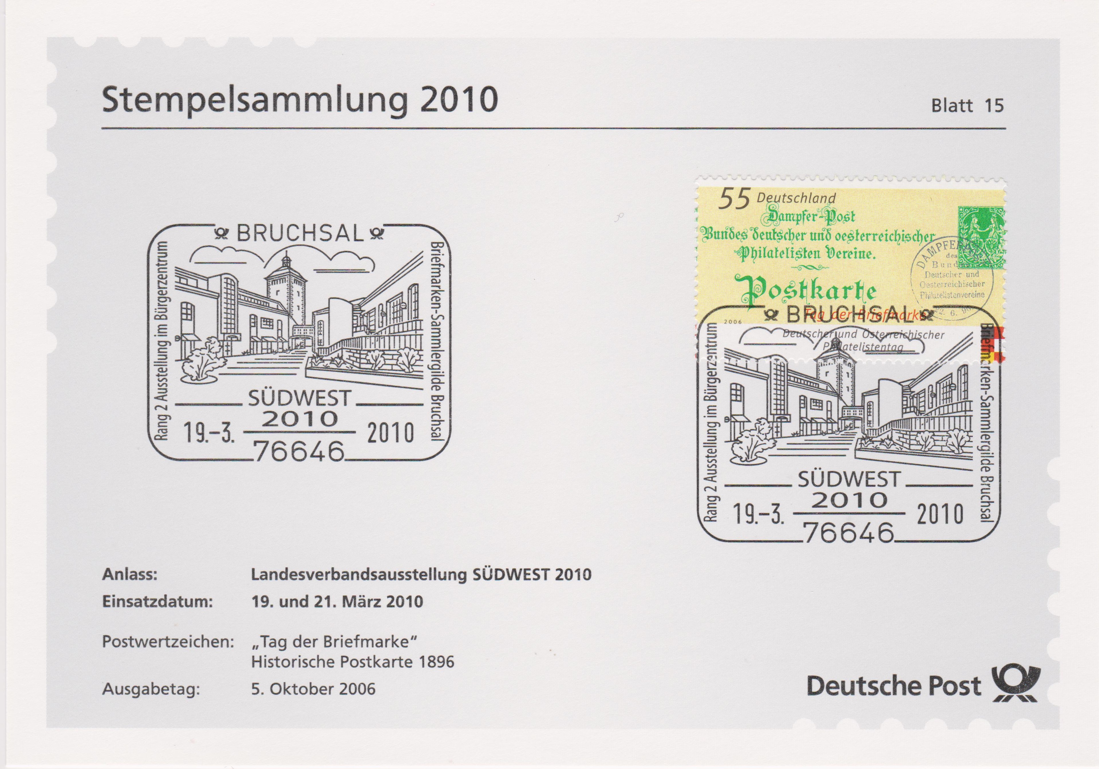 Das Postwertzeichen der Deutschen Post zum "Tag der Briefmarke 2006", MiNr. 2565, wurde am 19.03.2010 auf Blatt 15 der Deutsche Post Stempelsammlung 2010 mit einem Sonderstempel zur Landesverbandsausstellung SÜDWEST 2010 versehen: