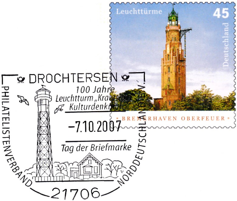 Ganzsachenpostkarte des Philatelistenverbandes Norddeutschland e.V. zum Tag der Briefmarke 2007 mit dem dazu passenden Sonderstempel vom 7.10.2007 aus Drochtersen.