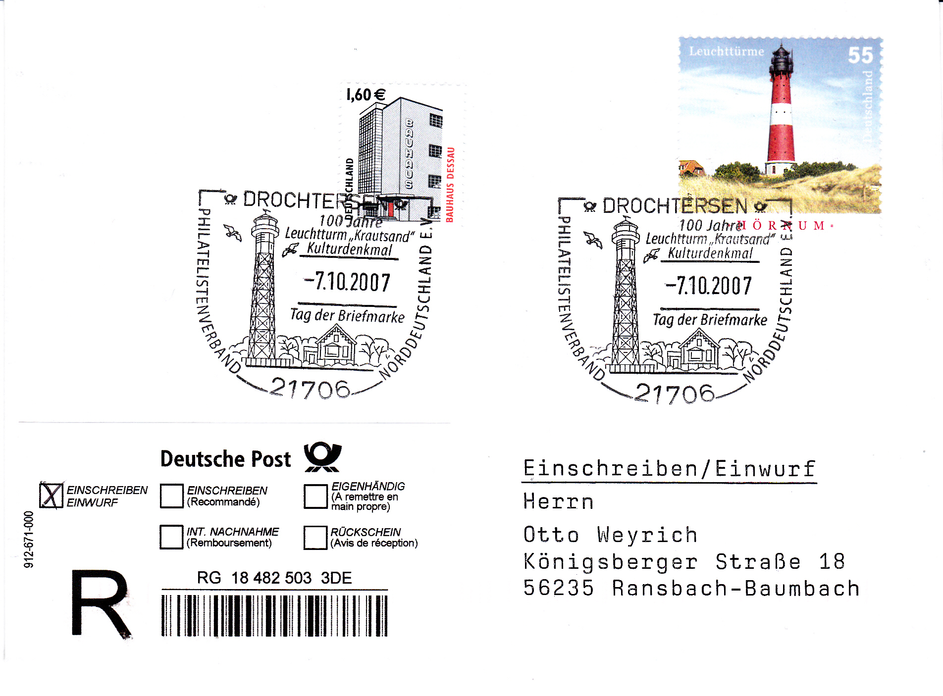 Dieser Stempel aus Drochtersen wurde auch auf diesem Brief per Einwurf-Einschreiben zum Entwerten der Marken verwendet.