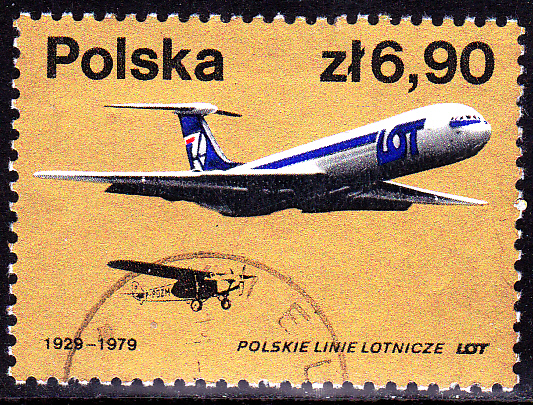 Auf dieser Marke aus Polen ist im oberen Teil der Marke eine lljuschin Il-62M aus dem Jahre 1979 abgebildet.
