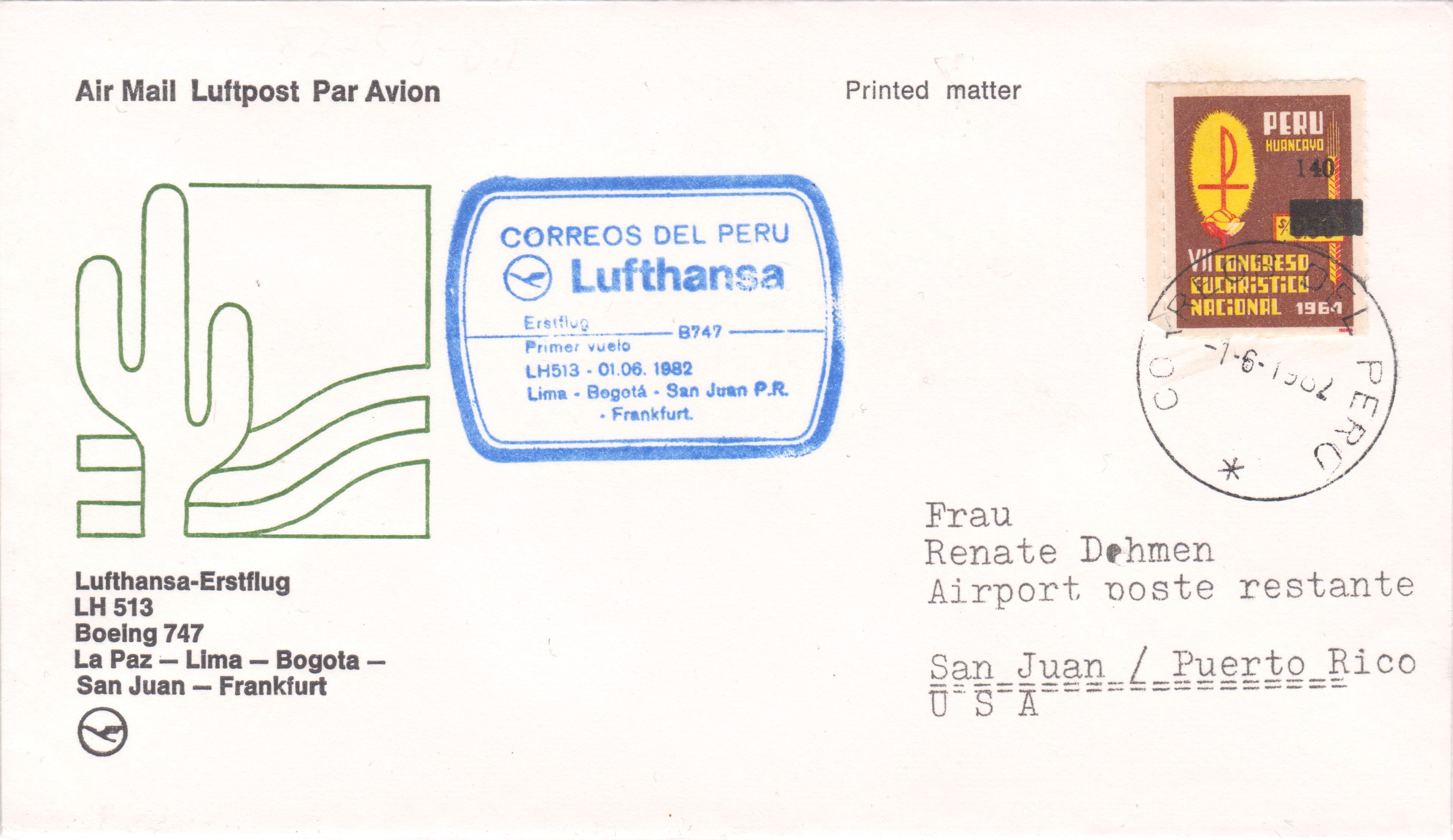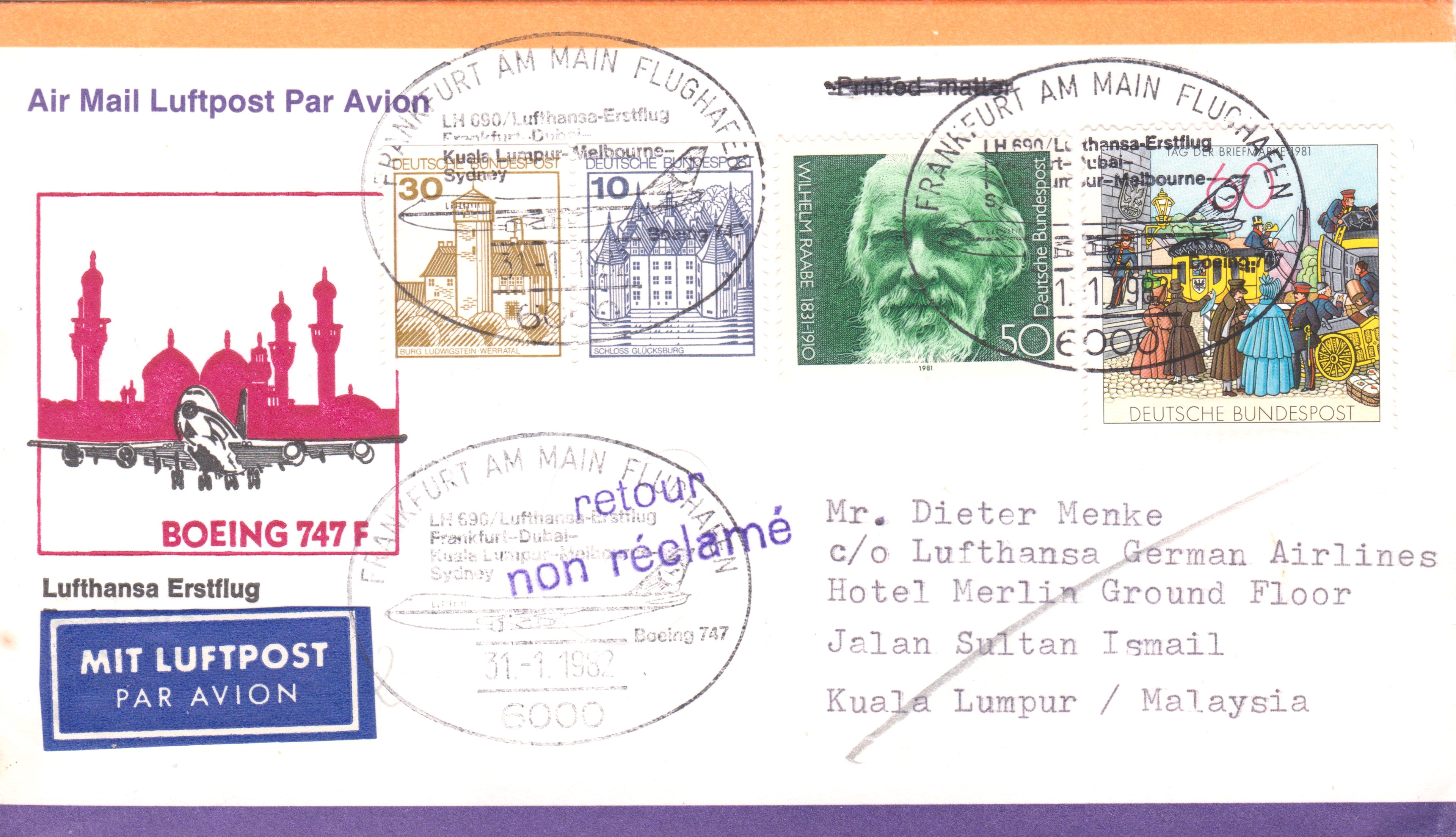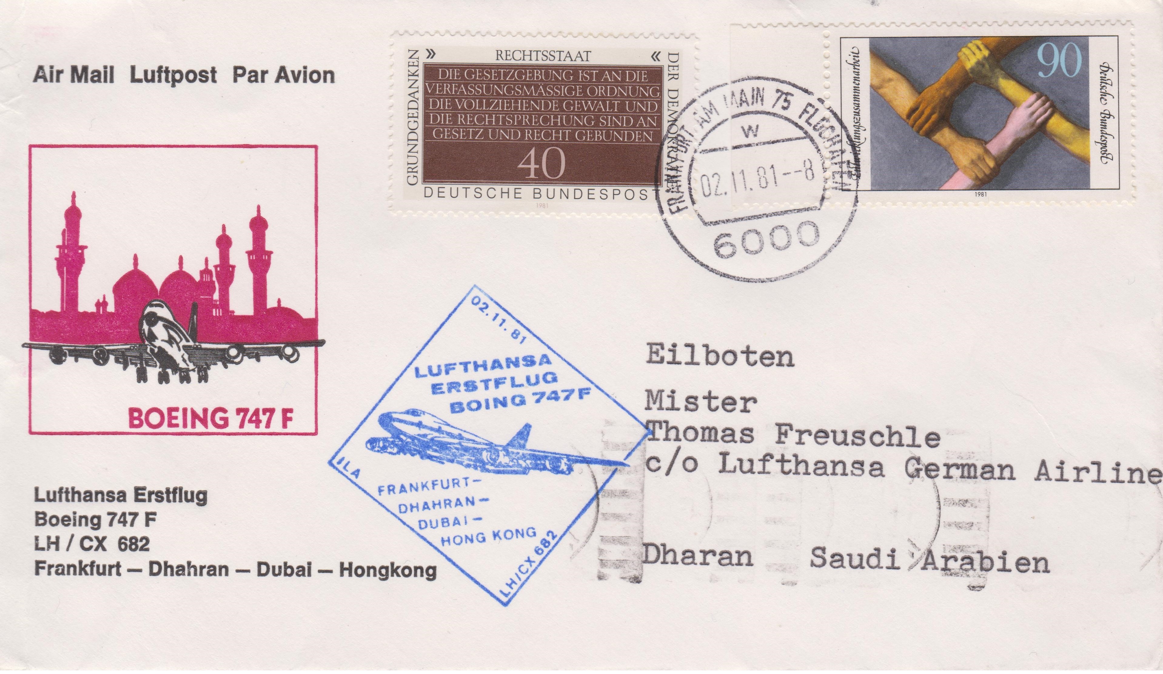 Dieser Beleg vom 02.11.1981 dokumentiert die erste Etappe FRANKFURT - DHAHRAN des Lufthansa Erstflugs LH / CX 682 mit einer BOEING 747 F am 02.11.1981: