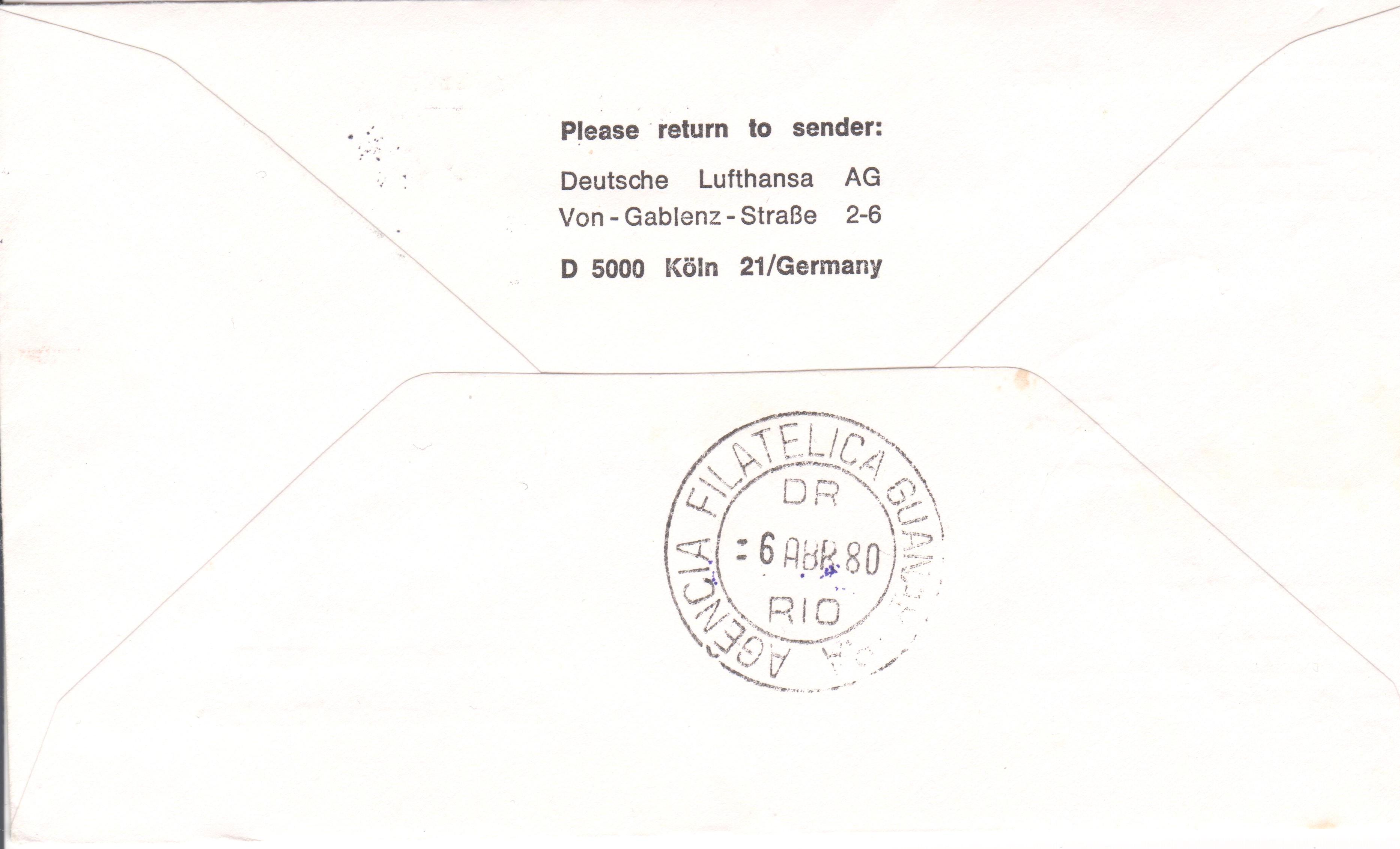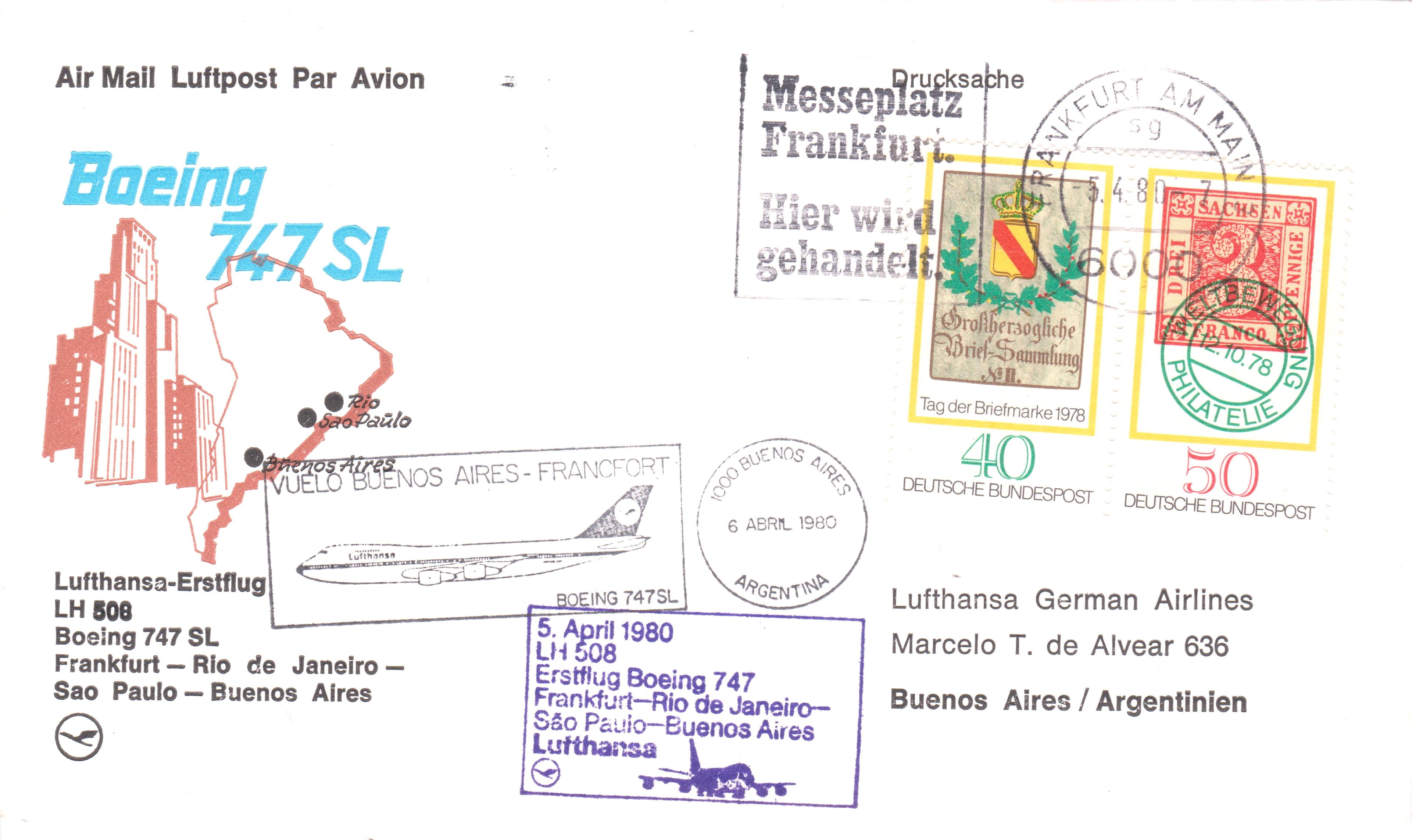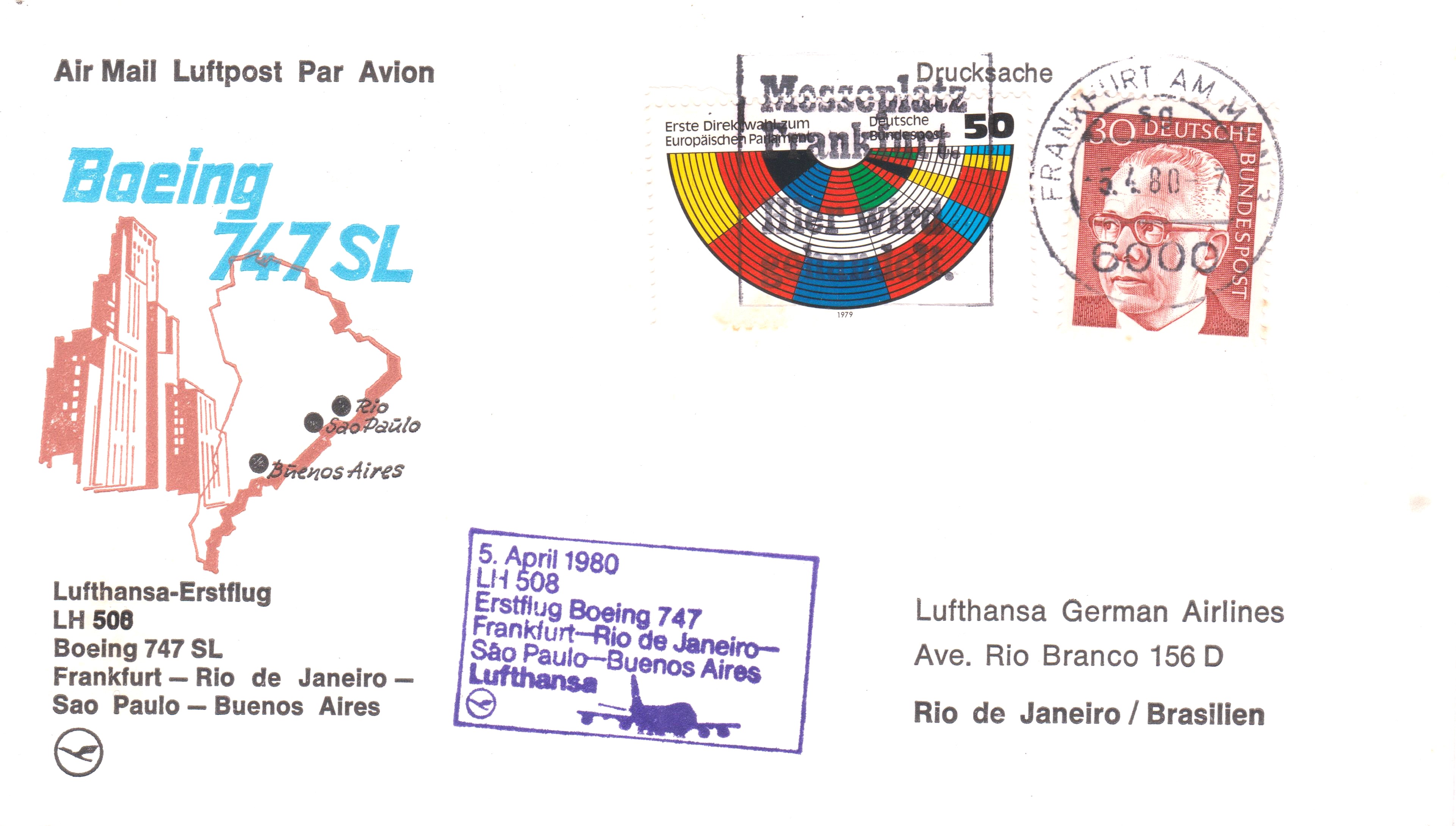 Diese Belege vom 05.04.1980 dokumentieren den Lufthansa Erstflugs LH 508 Frankfurt - Rio de Janeiro - Sao Paulo - Buenos Aires mit einer BOEING 747 SL am 05./06.04.1988: