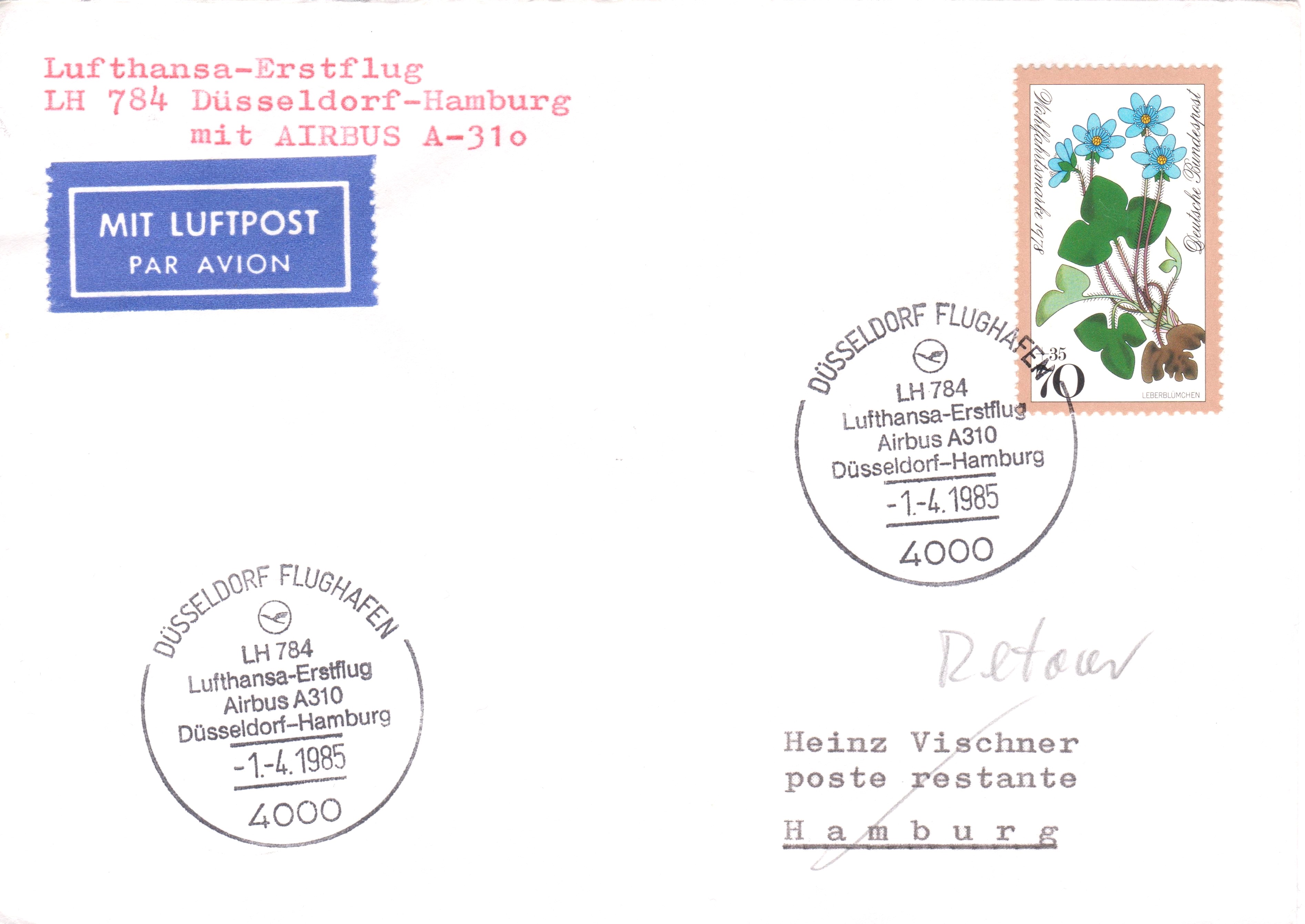 Dieser Beleg dokumentiert den Lufthansa-Erstflug LH 784 Düsseldorf - Hamburg, der am 01.04.1985 mit einem Airbus A310 erfolgte: