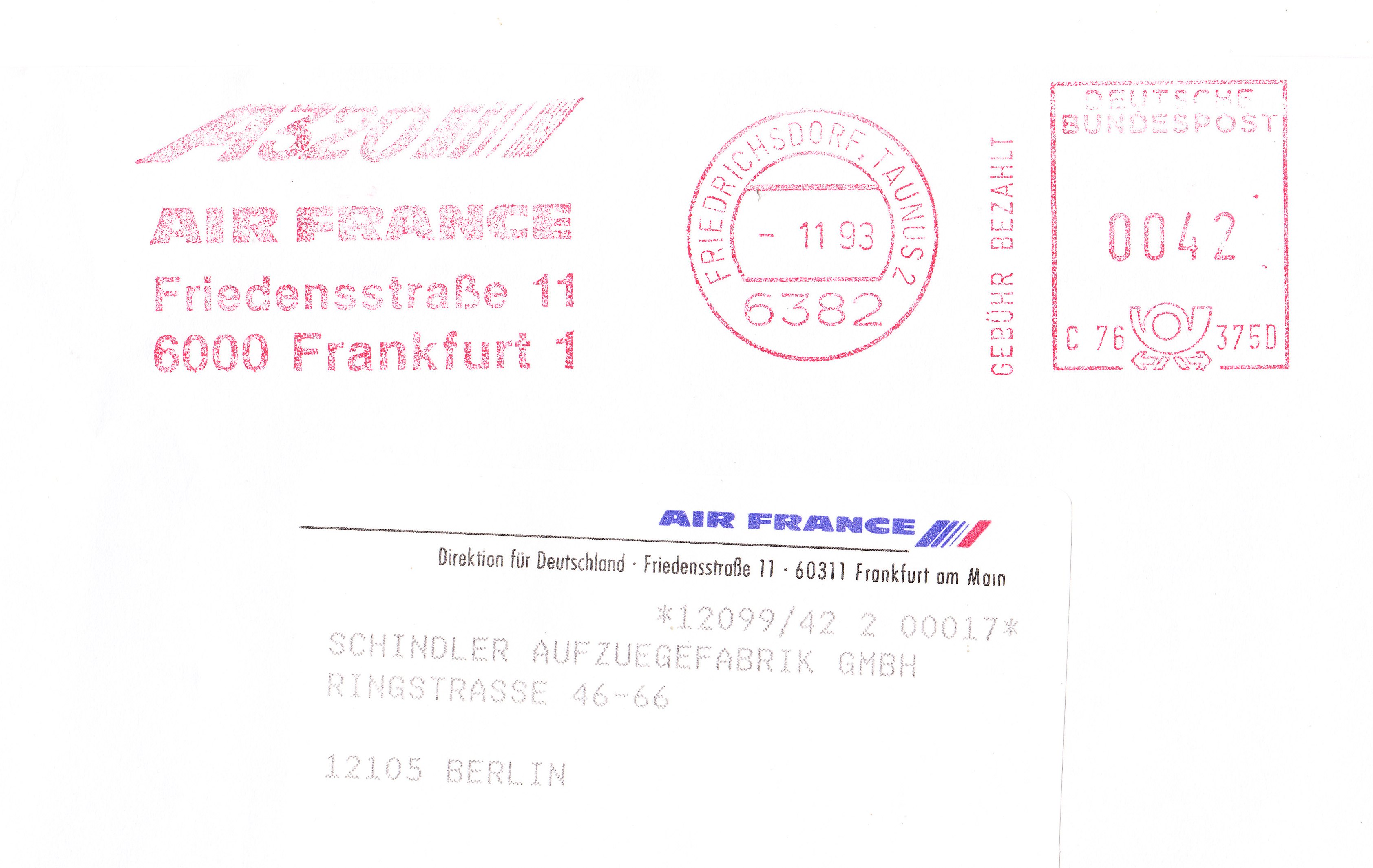 Die Fluggesellschaft AIR FRANCE flog den Maschinentyp "A320" und wies darauf im Werbeeinsatz ihres Absenderfreistempels hin: