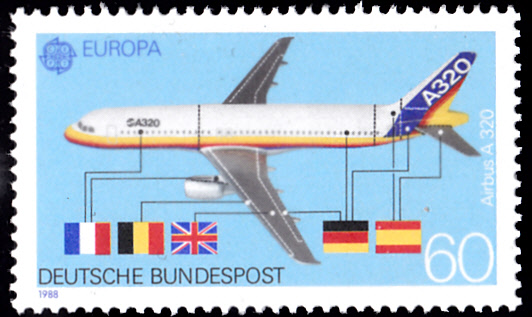 Auf der Europamarke 1988 zu 60 Pfennig der Deutschen Bundespost (MiNr 1367) ist ein "Airbus A 320" abgebildet.