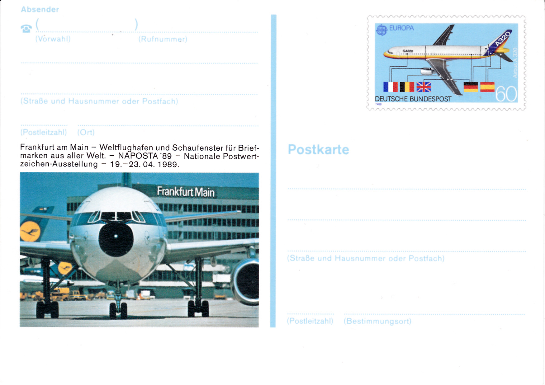 Zur "NAPOSTA' 89" in Frankfurt am Main ist eine Sonderpostkarte (MiNr PSo 17) mit dem Wertstempel der Europamarke 1988 mit der Abbildung "Airbus A320" erschienen. Auch im Bildzudruck ist ein Airbus 320 im Flughafen Frankfurt zu sehen.