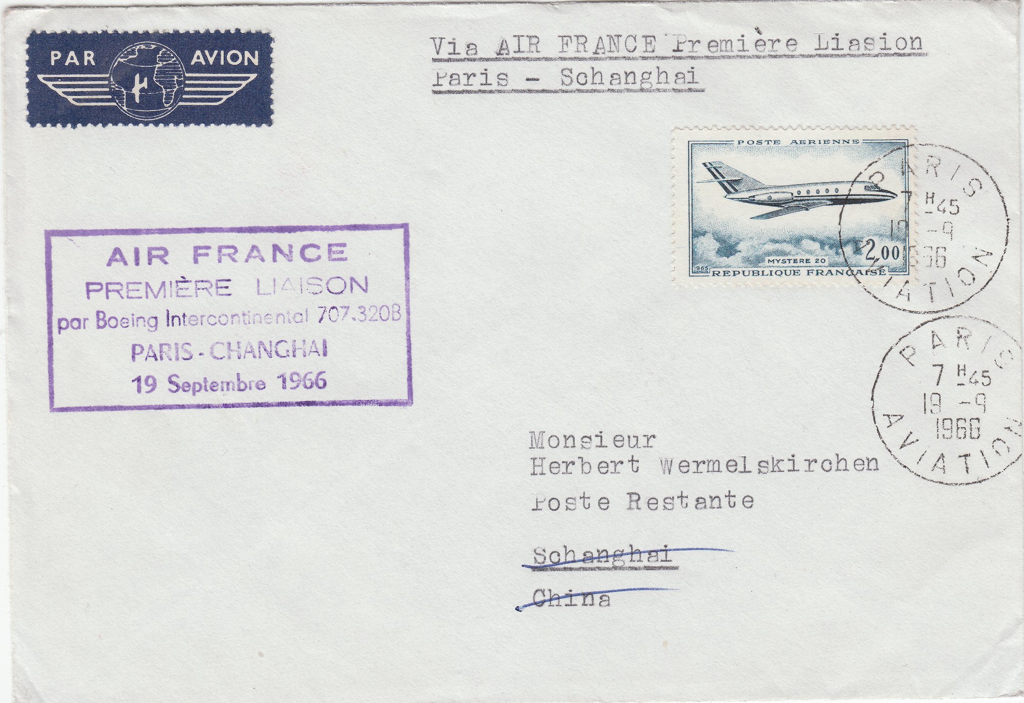 Dieser Beleg dokumentiert den Erstflug einer BOEING INTERCONTINENTAL 707-320B der AIR FRANCE am 19.09.1966 von Paris nach Shanghai:
