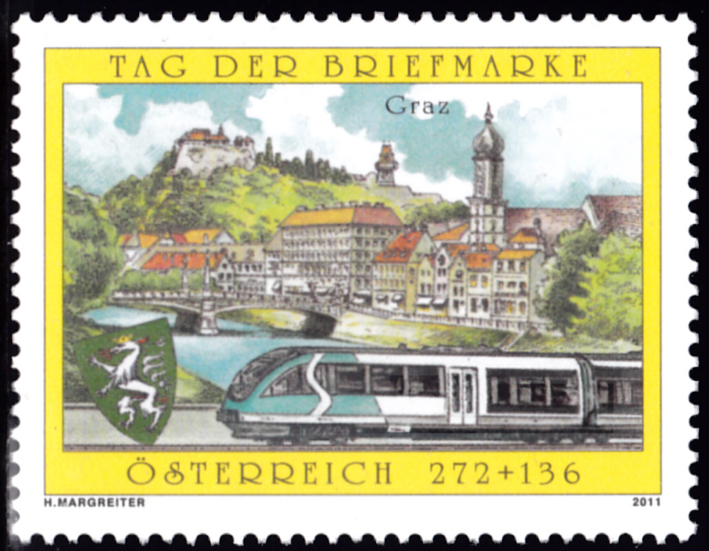 Hier zeige ich eine postfrische Marke zum Tag der Briefmarke 2011 (MiNr 2936). Sie zeigt eine Stadtansicht von Graz und einen Triebwagen Typ Desiro der S-Bahn Graz.