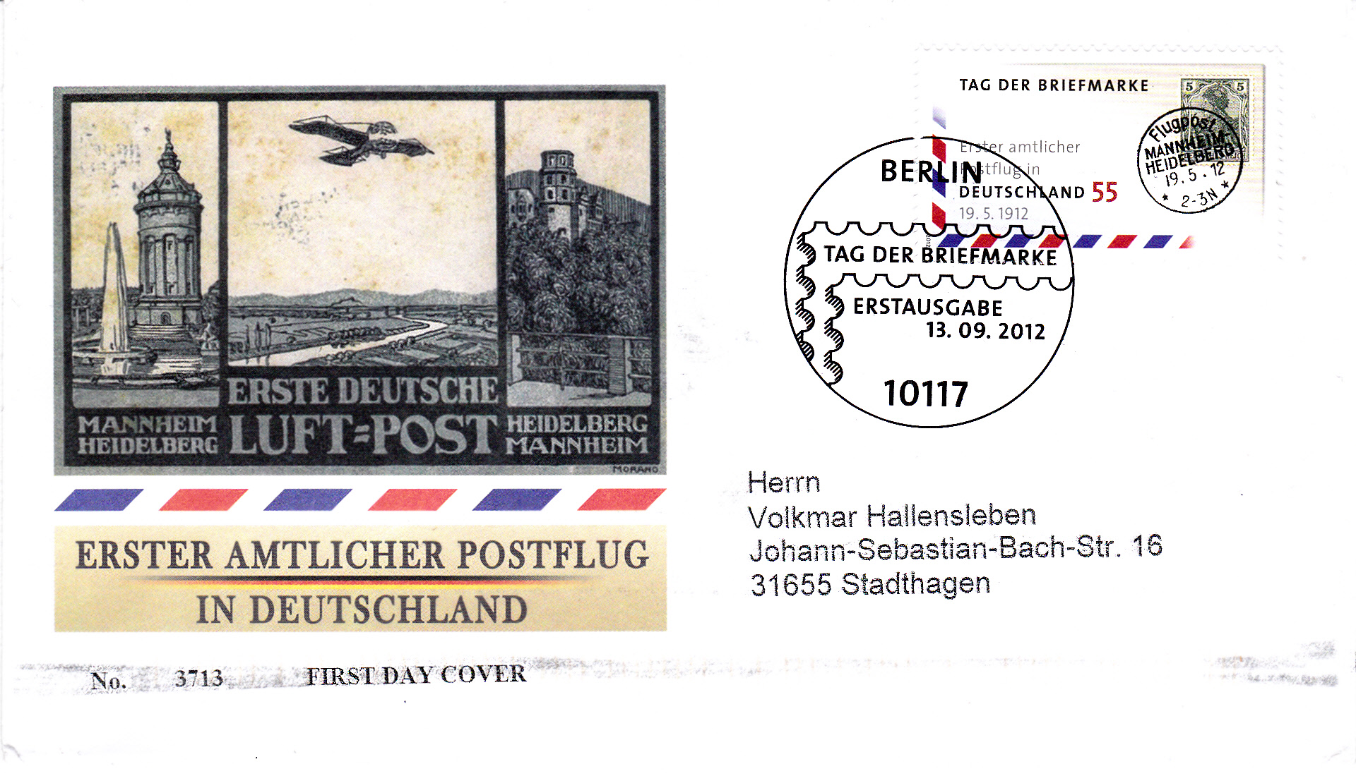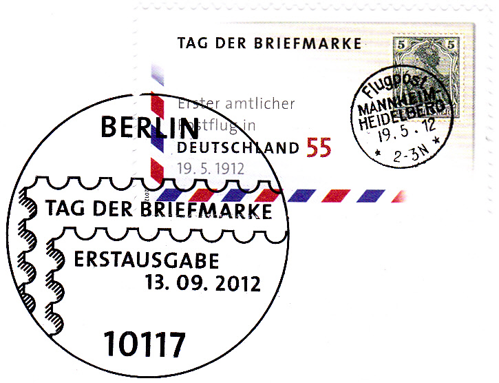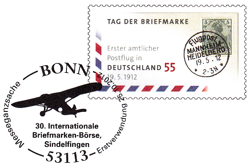 Zur 30. Int. Briefmarken Börse Sindelfingen erschien am 11.10.2012 ein Sonderumschlag mit dem Wertstempel "Tag der Briefmarke 2012". Hier ein Exemplar mit einer Zusatzfrankatur von insgesamt 7 Cent, da das Porto bis zum Versanddatum am 15.6.2015 von 55 auf 62 Cent gestiegen war.