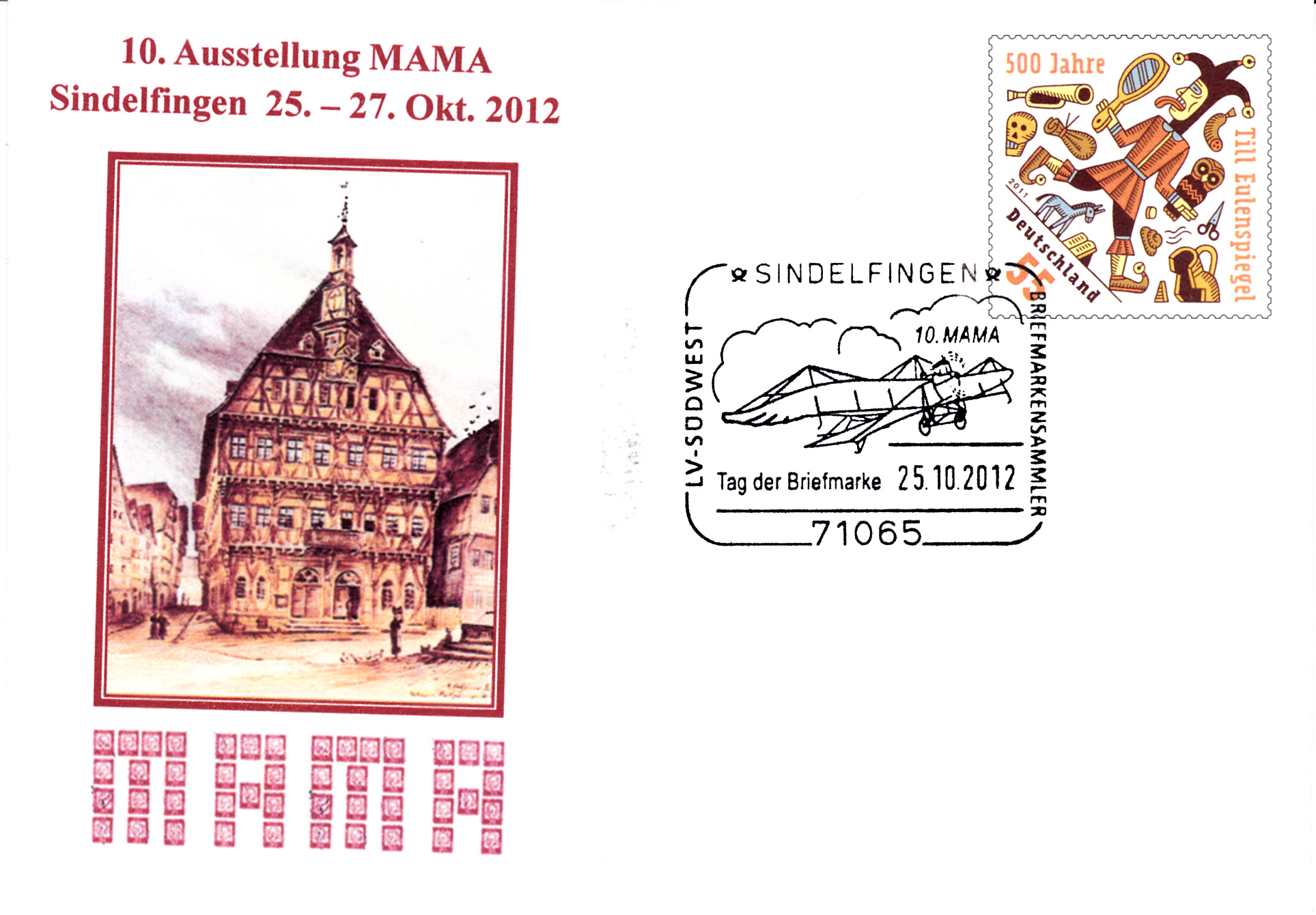Plusbrief (MiNr USo 254) mit dem Wertstempel "Till Eulenspiegel" (MiNr 2880) und mit einem Zudruck zur Ausstellung MAMA und dem Sonderstempel vom 25.10.2012 aus Sindelfingen zum Tag der Briefmarke 2012 des LV Südwest.