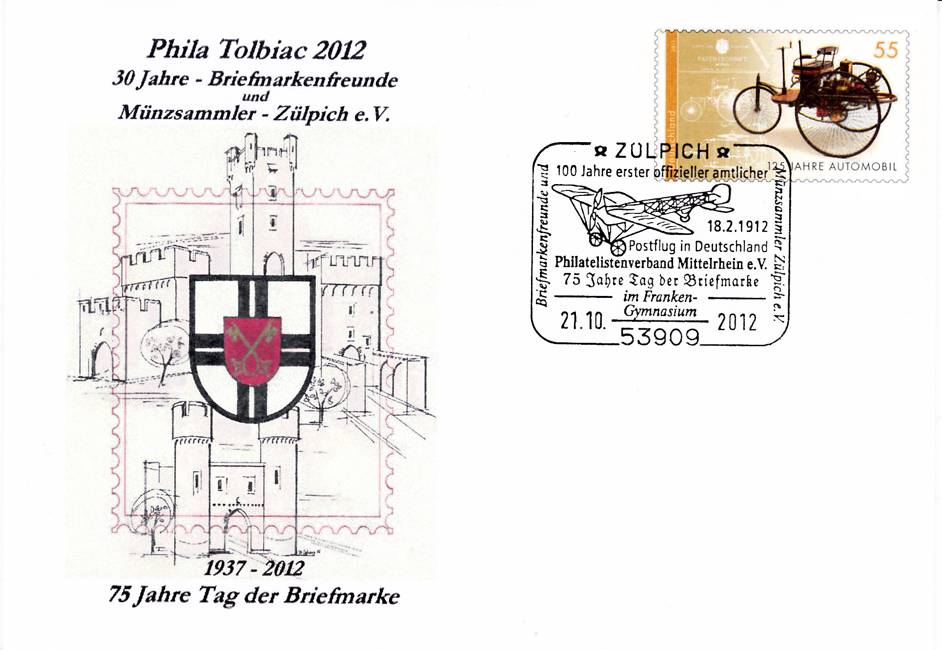 C6-Blanko-Umschlag mit nassklebender Verschlusskappe (MiNr USo 239) mit dem Wertstempel "125 Jahre Automobil" (MiNr 2867) und mit einem Zudruck zur Ausstellung Phila Tolbiac 2012 und dem Sonderstempel vom 21.10.2012 aus Zülpich zum Tag der Briefmarke 2012 des Philatelistenverbandes Mittelrhein e.V.