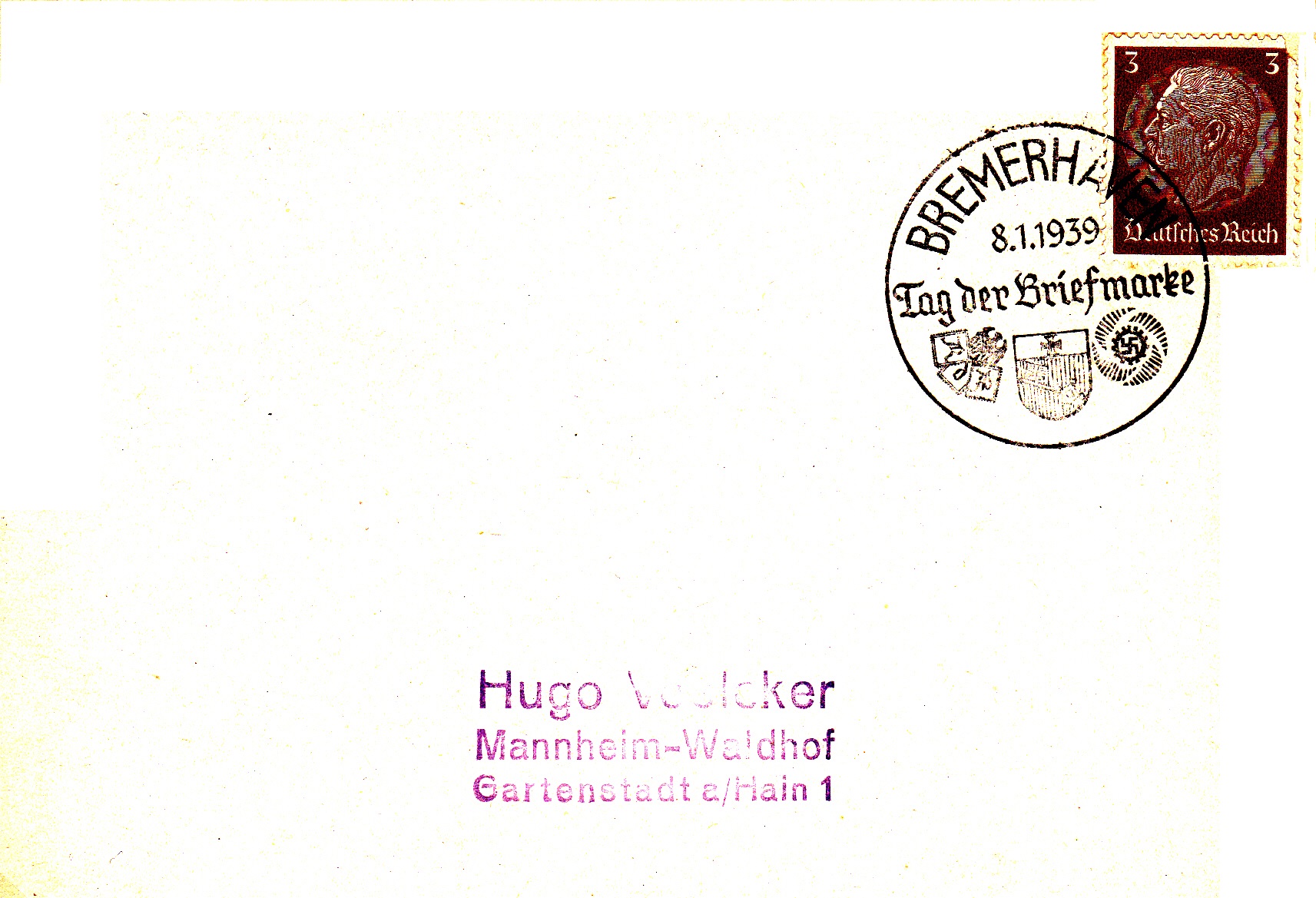 Sonderstempel zum Tag der Briefmarke 1939 vom 8.1.1939 aus Bremerhaven auf einer Postkarte nach Mannheim-Waldhof.