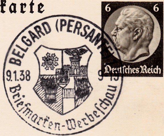 Sonderstempel zu einer Briefmarkenschau vom 9.1.1938 (Tag der Briefmarke 1938) aus Belgard (Persante) 1 auf einer Bildpostkarte. Belgard heißt heute Białogard und ist eine Kreisstadt in der polnischen Woiwodschaft Westpommern.