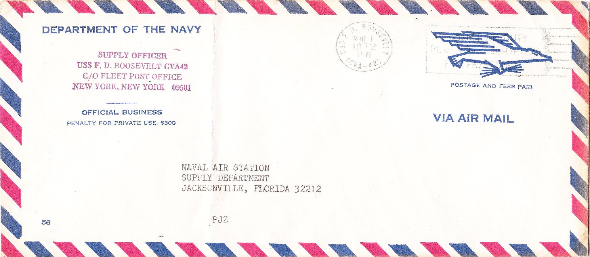 Dienstbrief mit Absender "SUPPLY OFFICER USS F. D. ROOSEVELT CVA42" sowie Bordstempel vom 01.03.1972, ebenfalls mit der Kennung CVA-42: