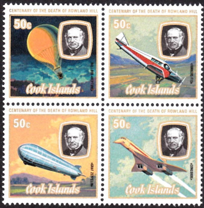 Die gezeigte Marke ist zum 100. Todestag von Rowland Hill erschienen und wurde mit drei weiteren Marken dieser Serie zusammenhängend als Vierblock gedruckt. Hier zeige ich auch den kompletten Viererblock.