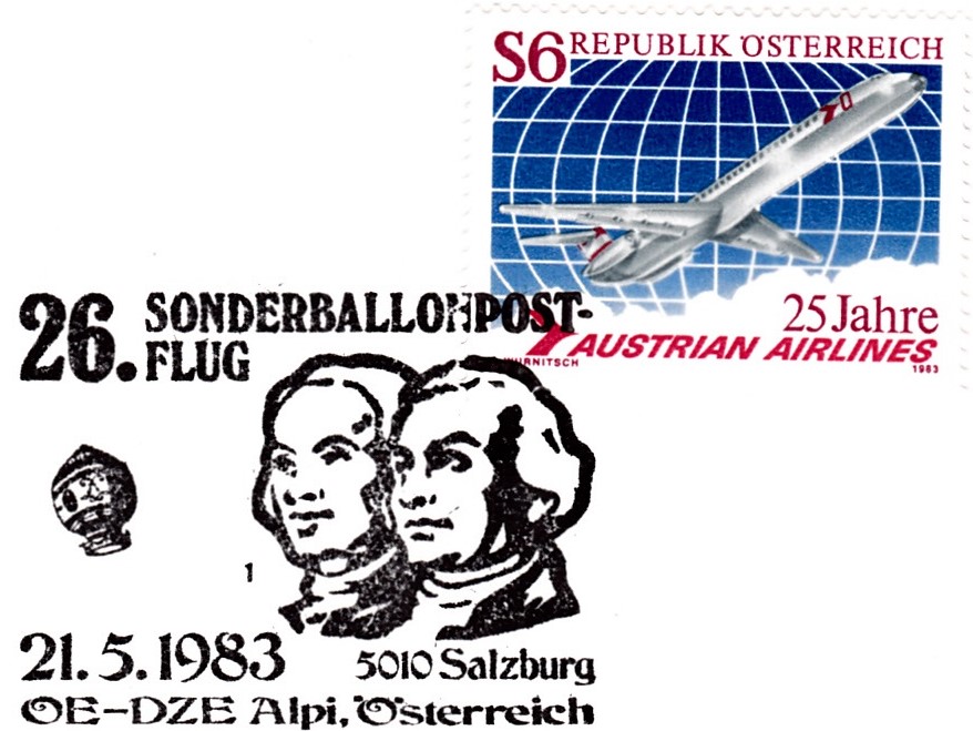 In diesem Sonderstempel aus Salzburg vom 21.5.1983 werden die Brüder Joseph Michel und Jacques Etienne Montgolfier sowie deren Heißluftballon Montgolfière gezeigt.