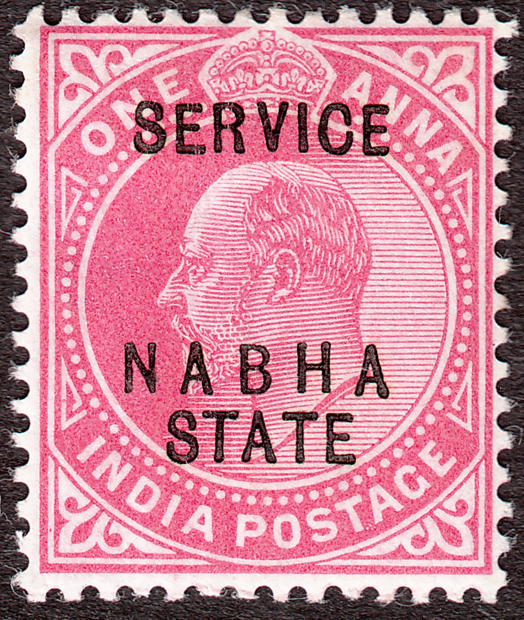 Die Originalmarke Indien MiNr. 57 wurde mit einem Aufdruck SERVICE NABHA STATE versehen als Dienstmarke MiNr. D 18 in Nabha ausgegeben: