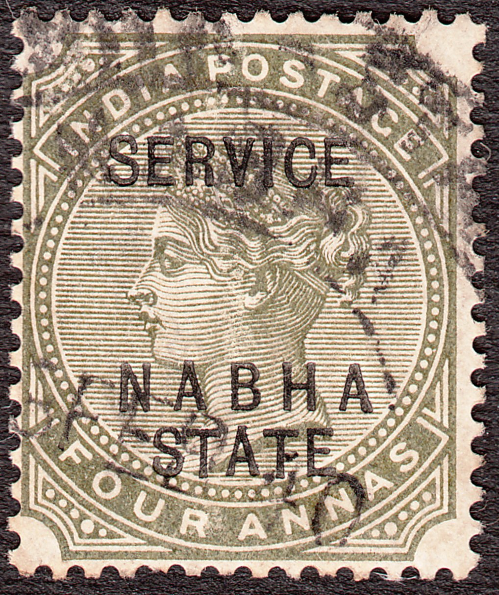 Die Freimarke Indien MiNr. 37 zu 4 Anna in olivgrün wurde mit einem dreizeiligen schwarzen Aufdruck "SERVICE NABHA STATE" versehen als Dienstmarke Nabha MiNr. D 11 ausgegeben: