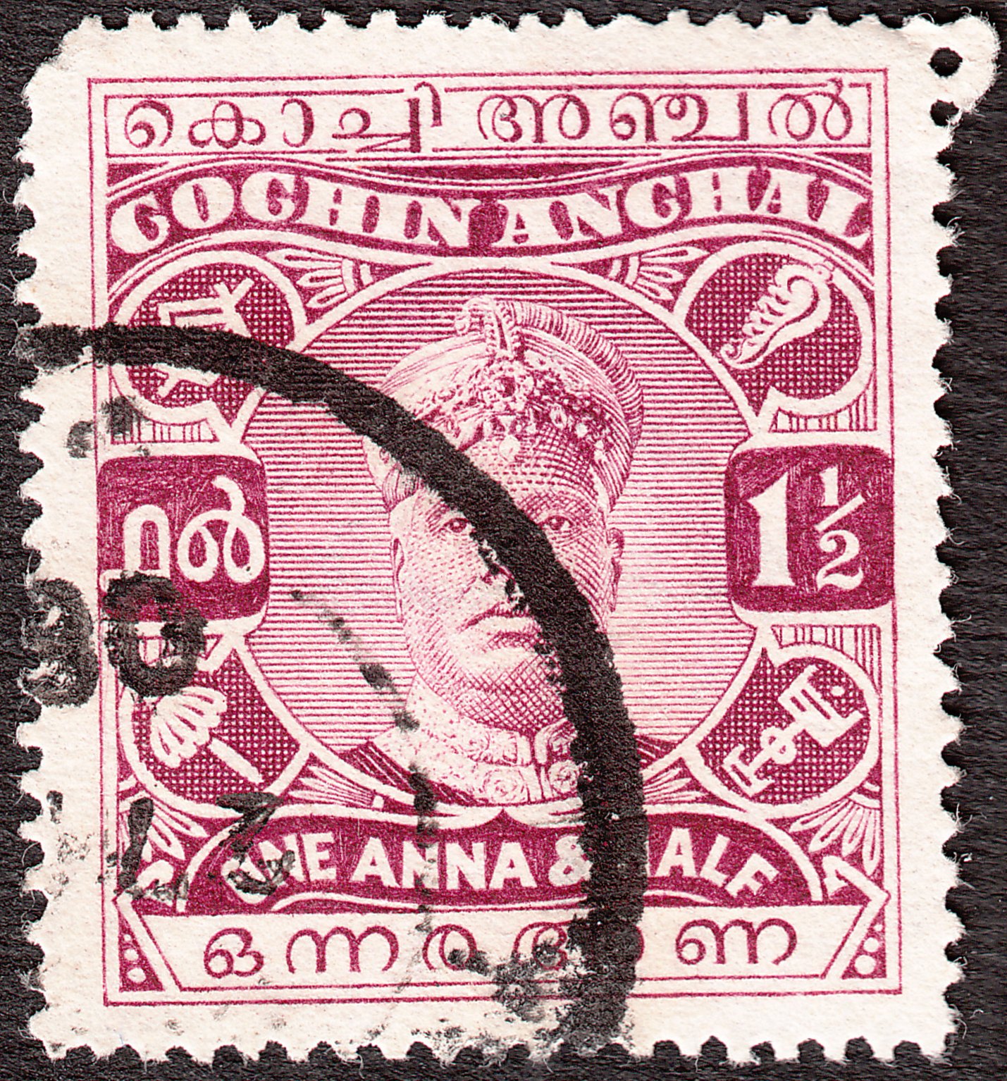 Die MiNr. 32 zu 1 1/2 Anna in purpur zeigt ein Kopfbild des Maharadscha Rama Varma (II.), der in Cochin von 1914 bis 1932 regierte: