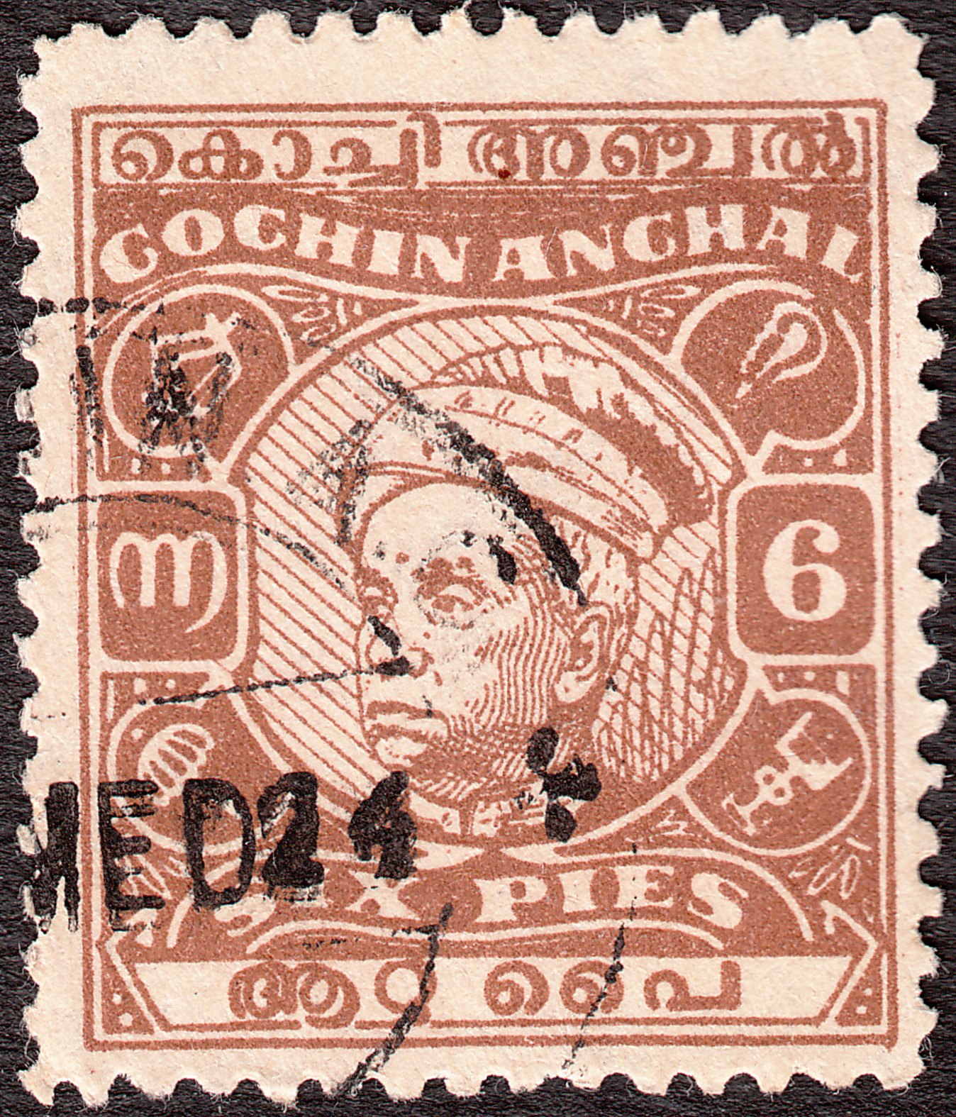 Die Freimarke Cochin MiNr. 96 zu 6 Pies in braun zeigt ein Kopfbild des Maharadschas Rama Varma (IV.), der in Cochin von 1948 bis 1964 regierte: