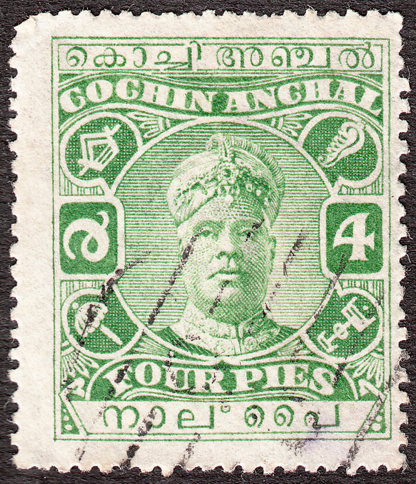 Die MiNr. 26 zu 4 Pies in grün zeigt ein Kopfbild des Maharadscha Rama Varma (II.), der in Cochin von 1914 bis 1932 regierte: