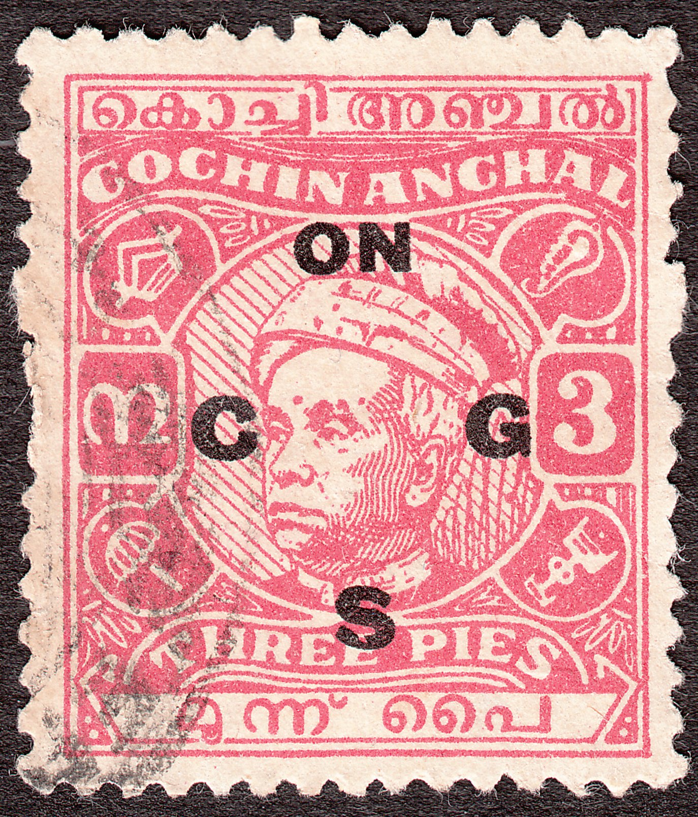 Die Freimarke Cochin MiNr. 94 wurde mit einem schwarzen Aufdruck "ON C G S" versehen als Dienstmarke ausgegeben: