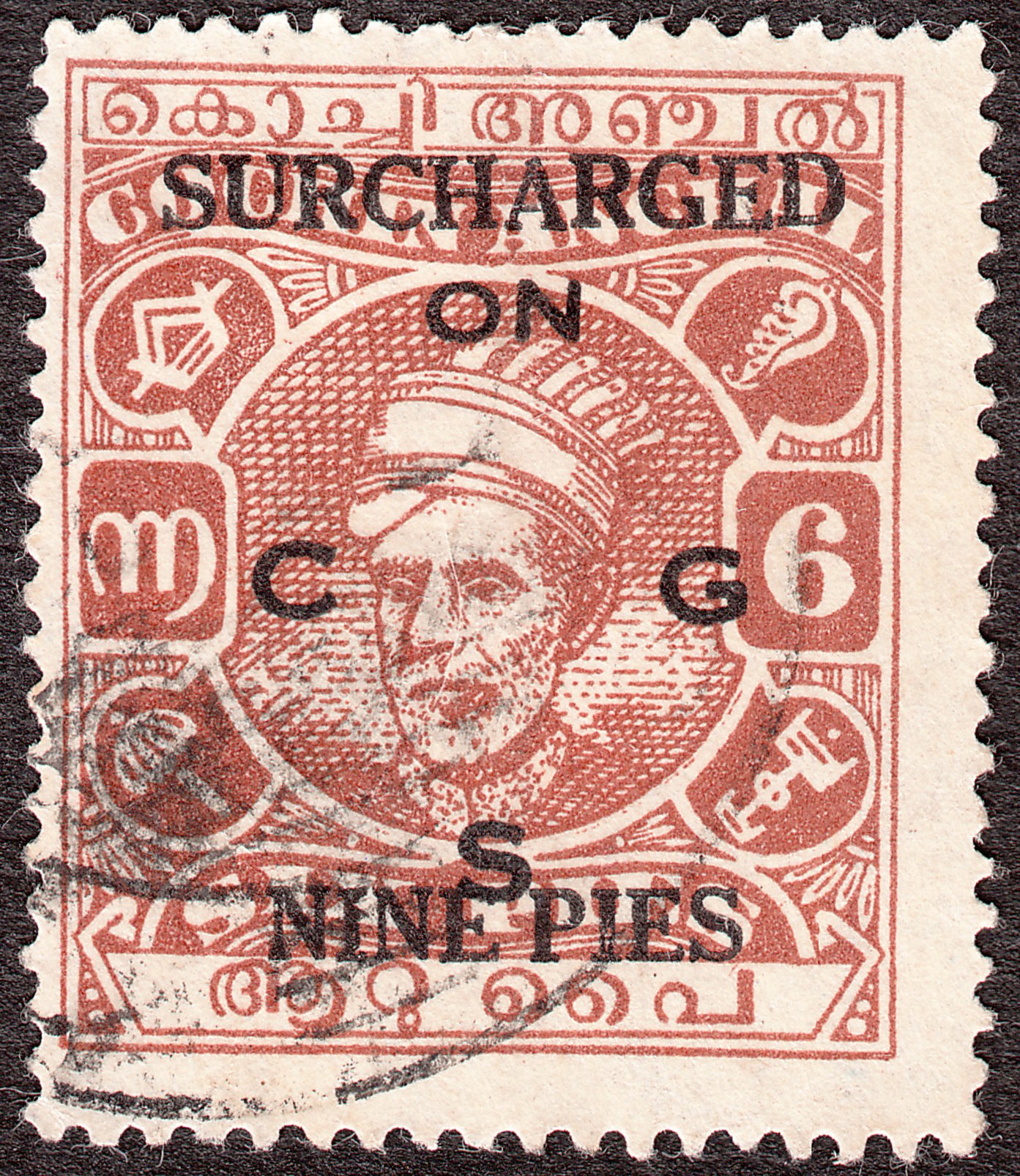 Die Dienstmarke Cochin MiNr. D 70 zu 6 Pies in rotbraun wurde 1944 mit schwarzem Aufdruck "SURCHARGED NINE PIES" versehen als Dienstmarke Cochin MiNr. D 77 ausgegeben: