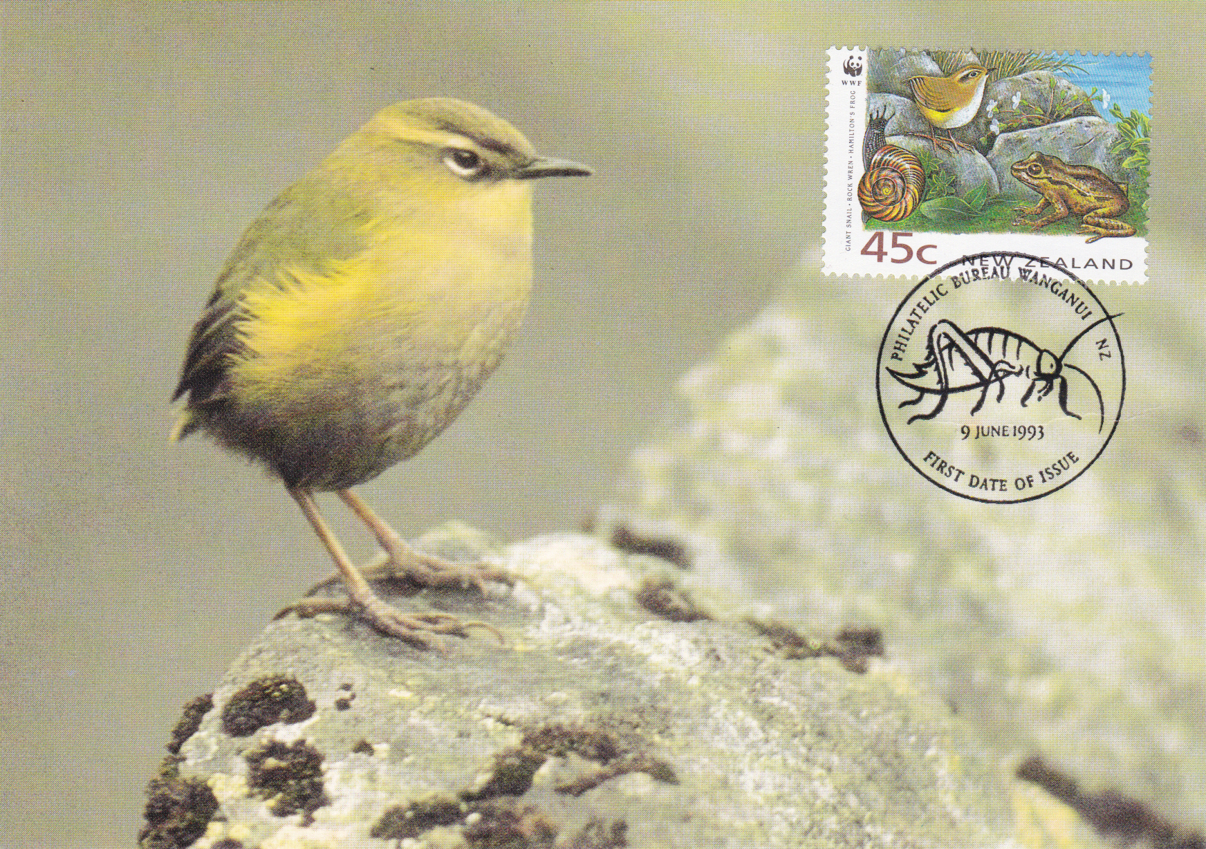 Auf einer Marke aus Neuseeland (MiNr 1292) sehen wir eine Riesenschnecke, einen Felsenstummelschwanz (Xenicus gilviventris) und einen Hamilton-Frosch (Leiopelma hamiltoni). Michel nennt fälschlicherweise den Namen Felsschlüpfer (Salpinctes obsoletus), das wäre aber der oben erwähnte Felsenzaunkönig.