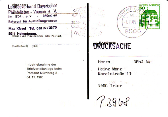 Die Briefverteilanlage wurde dann am 4.11.1985 endgültig in Betrieb genommen, was diese Drucksachenkarte belegt. Auf der Rückseite ist die gleiche Abbildung wie beim Beleg zum Probebetrieb.