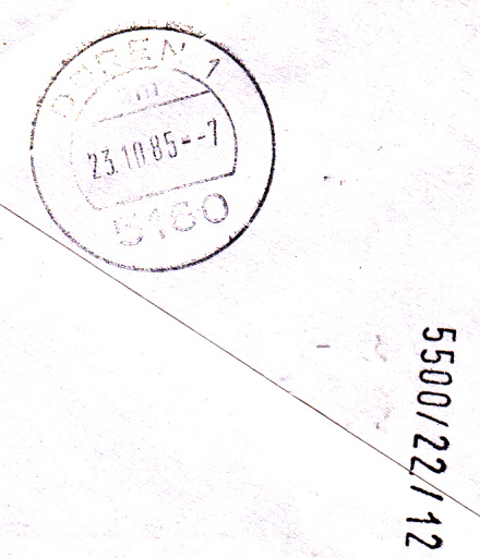 Hier zeige ich einen Kursbrief von Düren nach Trier. Die exakte Postverbindung ist links unten angegeben. Der Brief ist 28.10.1985 um 18 Uhr in Düren aufgegeben worden und wurde mit ÜP 516-1/17 B, Üp 510-1/11, Bp 5-ExprD 14 123 und ÜP 550-1/6 nach Trier befördert. Unterwegs erhielt er rückseitig einen Stempel ( 14123/28), der bestätigt, dass er mit dieser Bahnpost am 28. befördert wurde. Ein Ankunftsstempel in Trier wurde nicht abgeschlagen. Der Brief wurde nach Ankunft sofort ins Postfach gelegt. Das Briefporto betrug für den Brief bis 20 Gramm 80 Pfennig. Die monatliche Gebühr betrug 100 DM.
