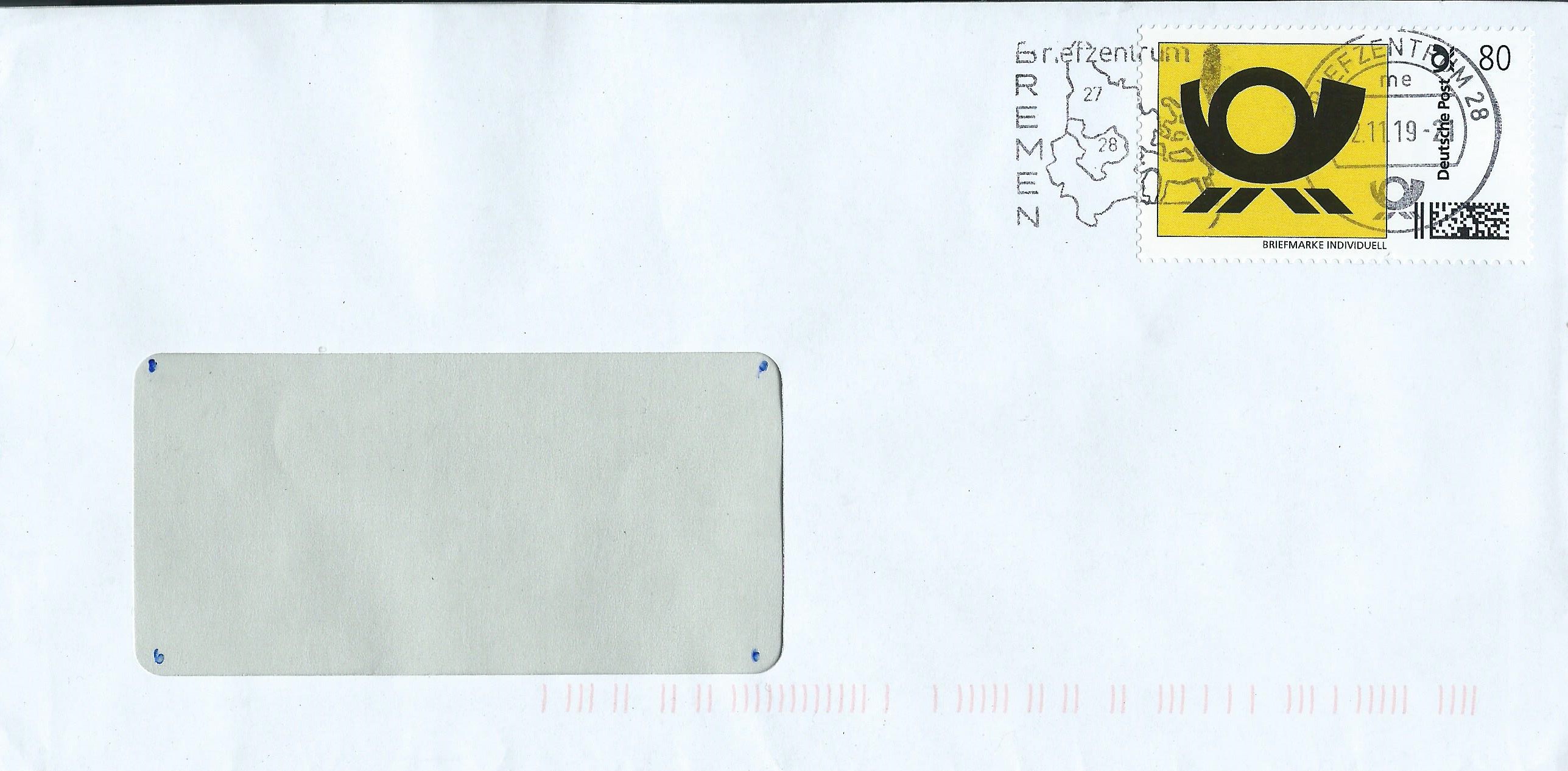 Einmal ein Wert zu 80 Cent mit dem Motiv Posthorn auf gelben Grund. Gestempelt wurde der Beleg im Briefzentrum 28 am 12.11.19.