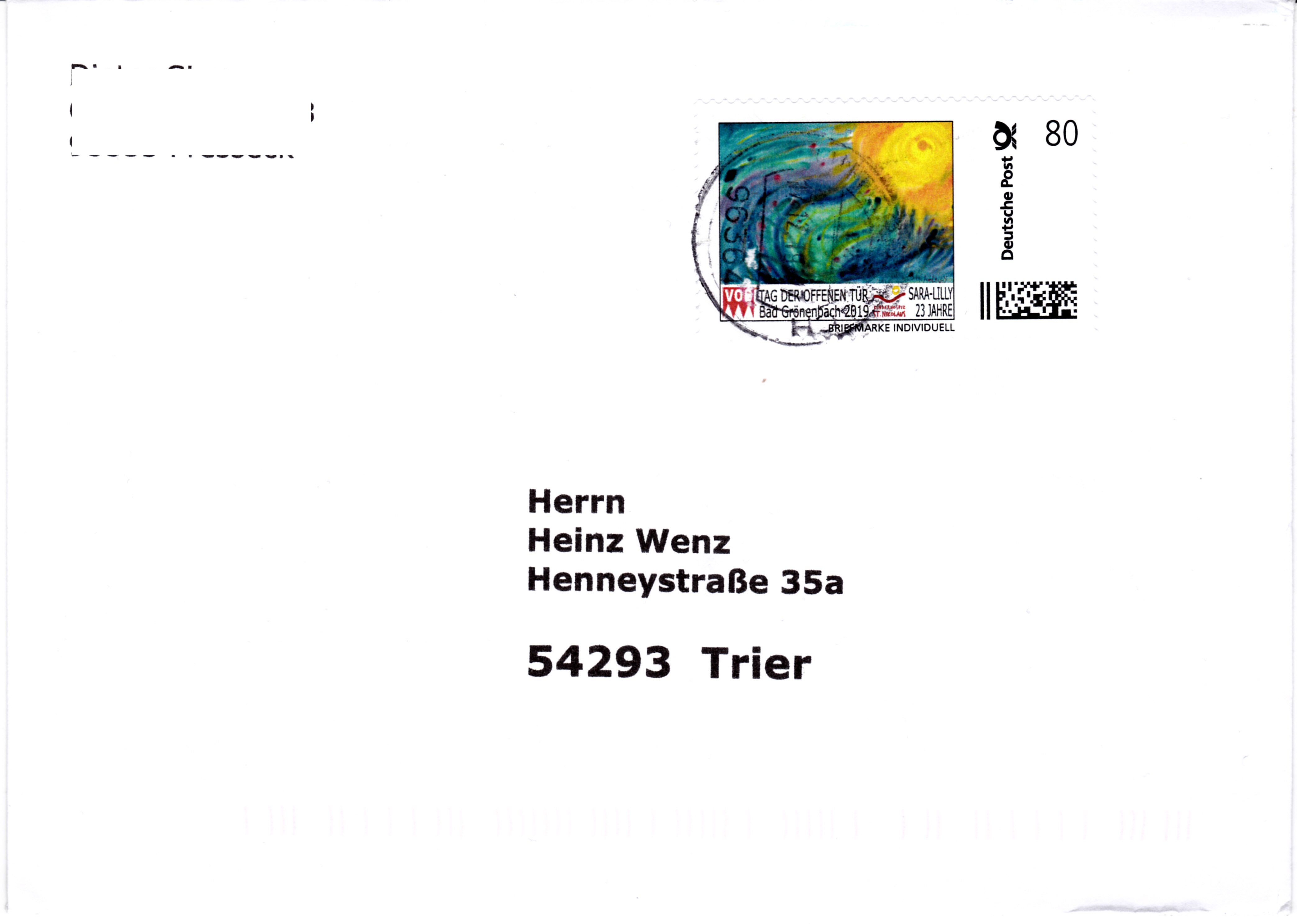 Auf diesem Umschlag wurde eine der hier schon vorgestellten Marken für die Benefizaktion zu Gunsten des Kinderhospiz St. Nikolaus in Bad Grönenbach zur Frankatur verwendet.