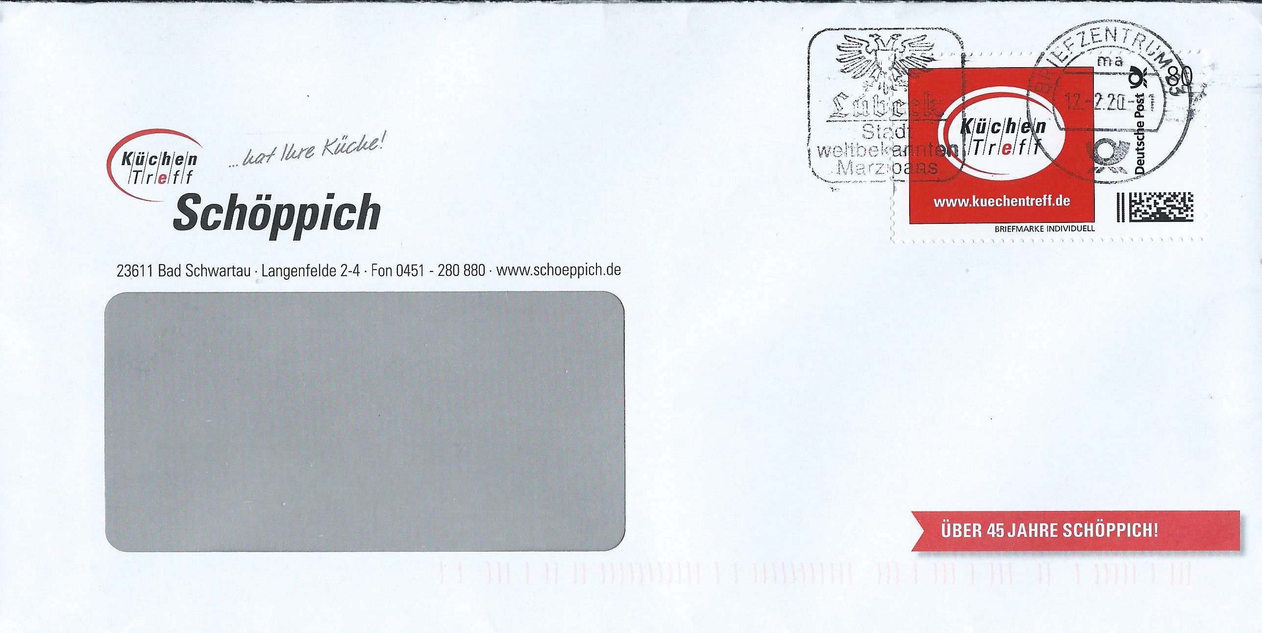 zur Marke individuell ein Neuzugang: Hier wirbt ein Kücheneinrichter für sich selbst. Es handelt sich um die Firma Küchentreff Schöppich aus Bad Schwartau, die sogar den Umschlag selber entsprechend bedruckt hat. Der Beleg ist richtig etwas fürs Auge, da ist alles stimmig! Gestempelt wurde hier am 12.2.20 im Briefzentrum 23.