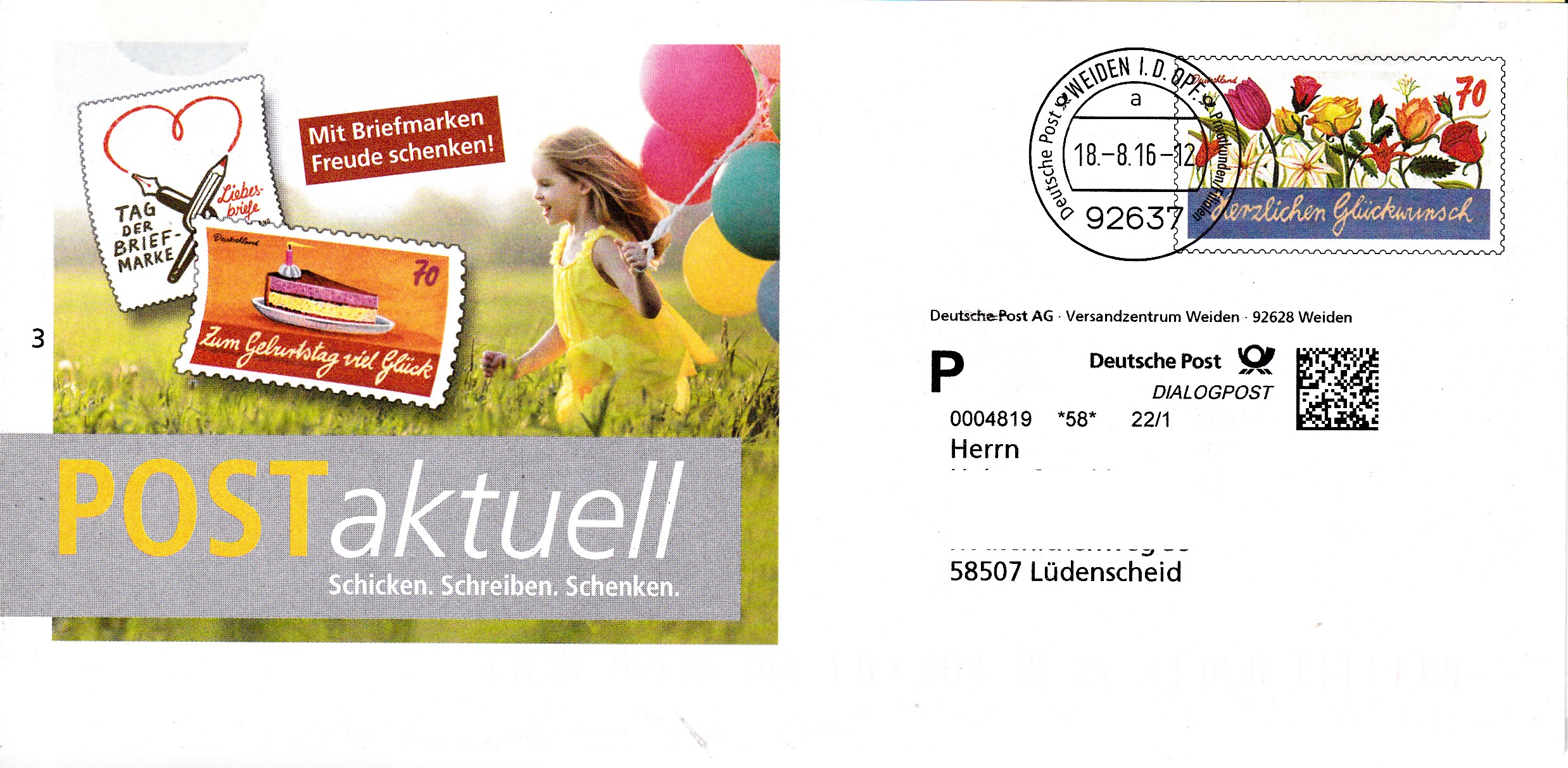 Faltbrief 210 mm x 102 mm mit Wertstempel "Grußmarken: Schreibanlässe/Herzlichen Glückwunsch" (MiNr 3232) mit aufgedruckter Zähnung und Vorausentwertung "Deutsche Post (Posthorn) WEIDEN I.D.OPF (Posthorn) Privatkunden/Filialen / a /18.-8.16-12".