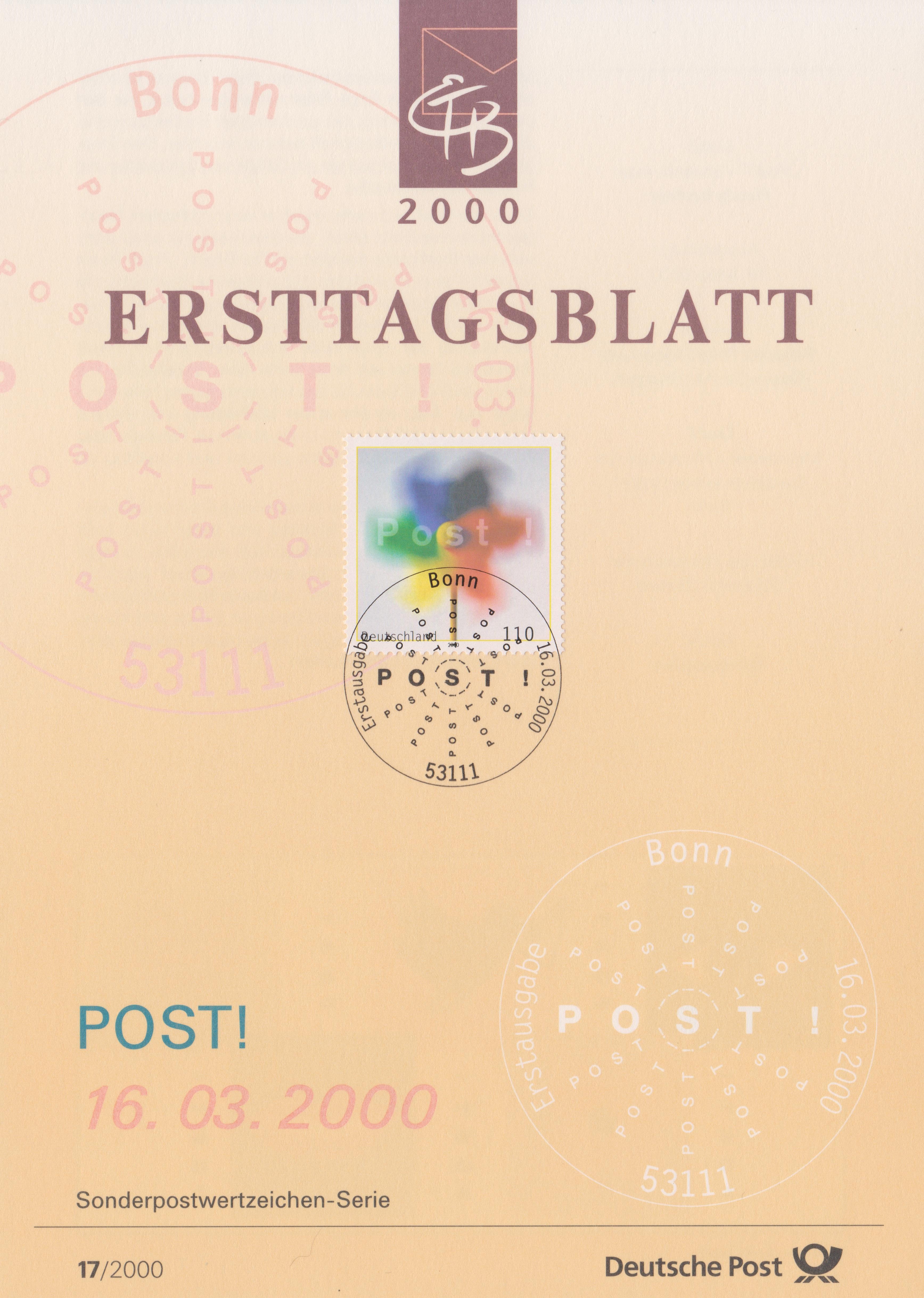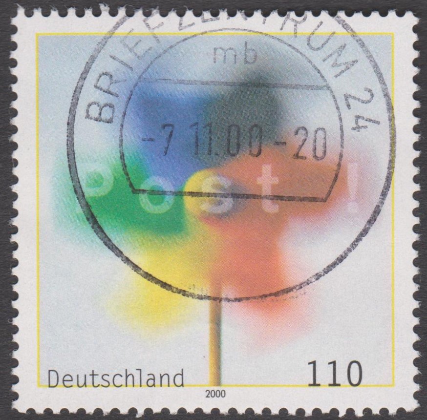 Mit diesem am 16.03.2000 erschienen Postwertzeichen "Post !", MiNr. 2106, mit der Darstellung eines Windrades, hier auf ETB 17/2000, begann eine Serie von Sondermarken mit Posteigenwerbung: