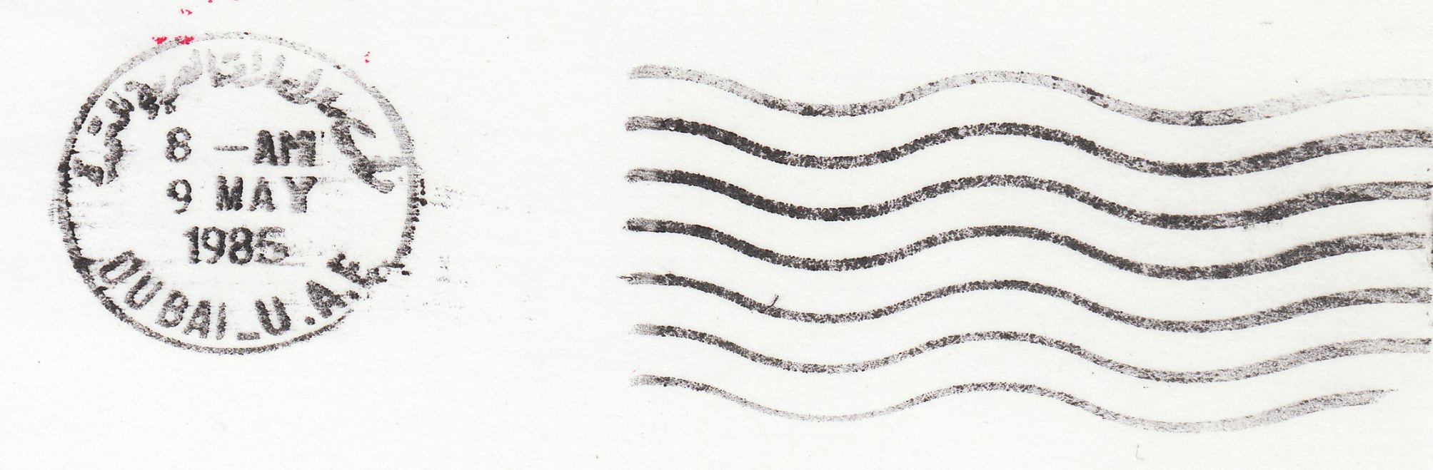 Laut rückseitigem Ankunftsstempel kam der Beleg schließlich am 09.05.1985 in Dubai an: